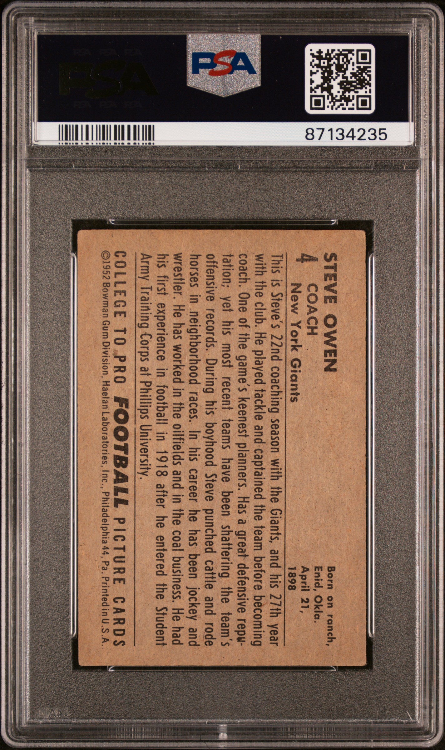 You are purchasing a 1952 Bowman Small Steve Owen #4 PSA 4. You will receive the exact item in the... Read more