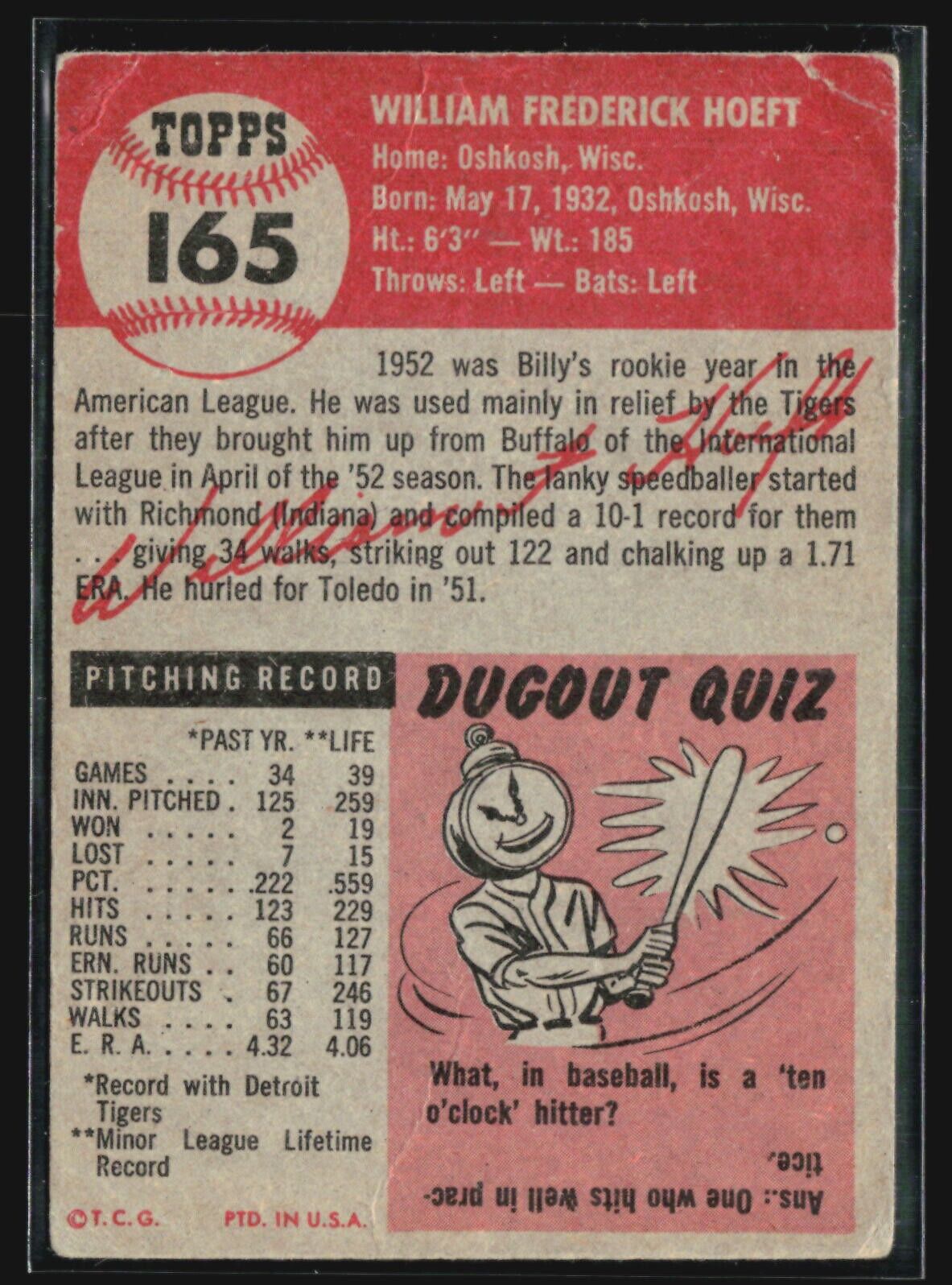 1953 Topps - #165 Billy Hoeft