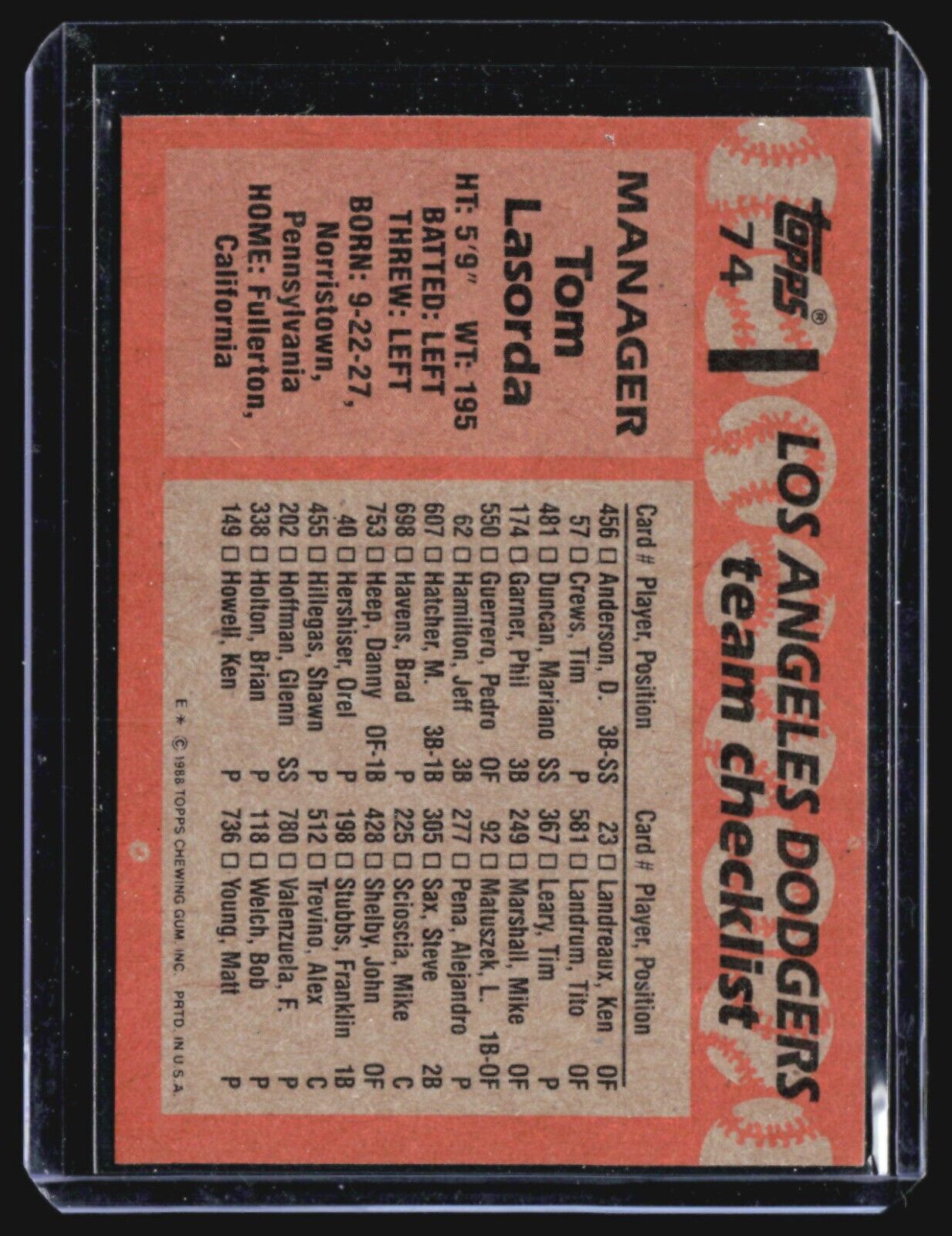 1988 Topps - Team Checklist #74 Tommy Lasorda