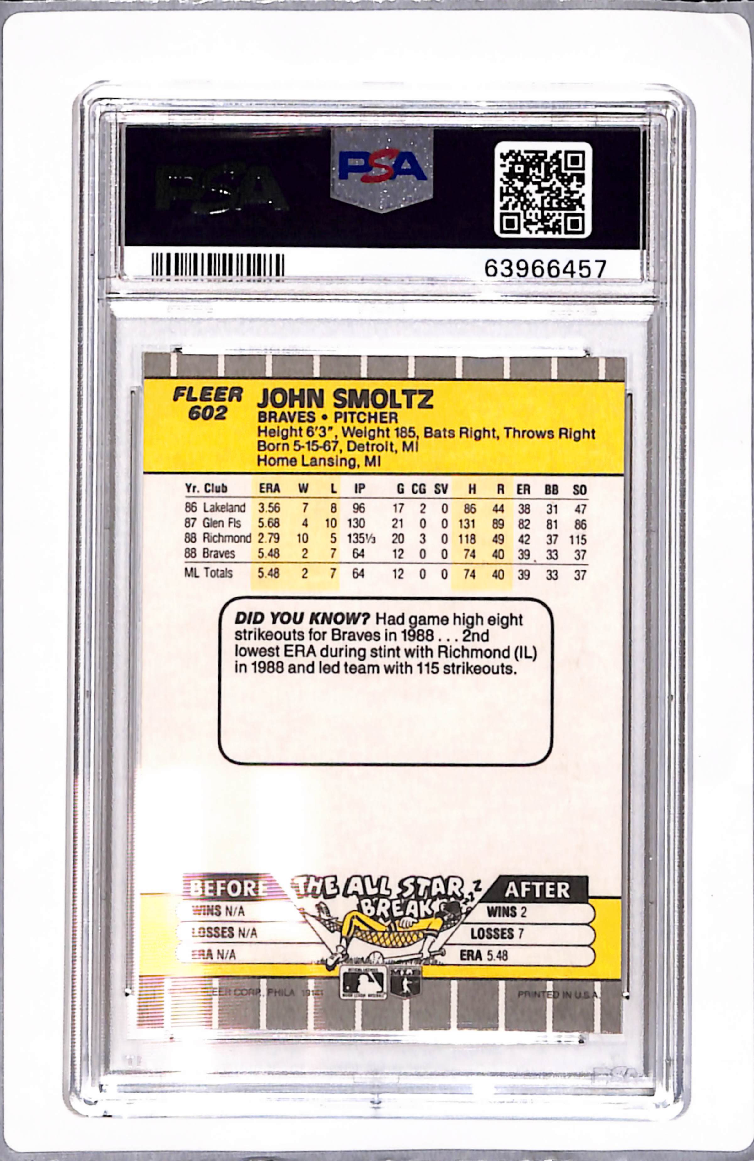1989 Fleer John Smoltz #602 PSA 10