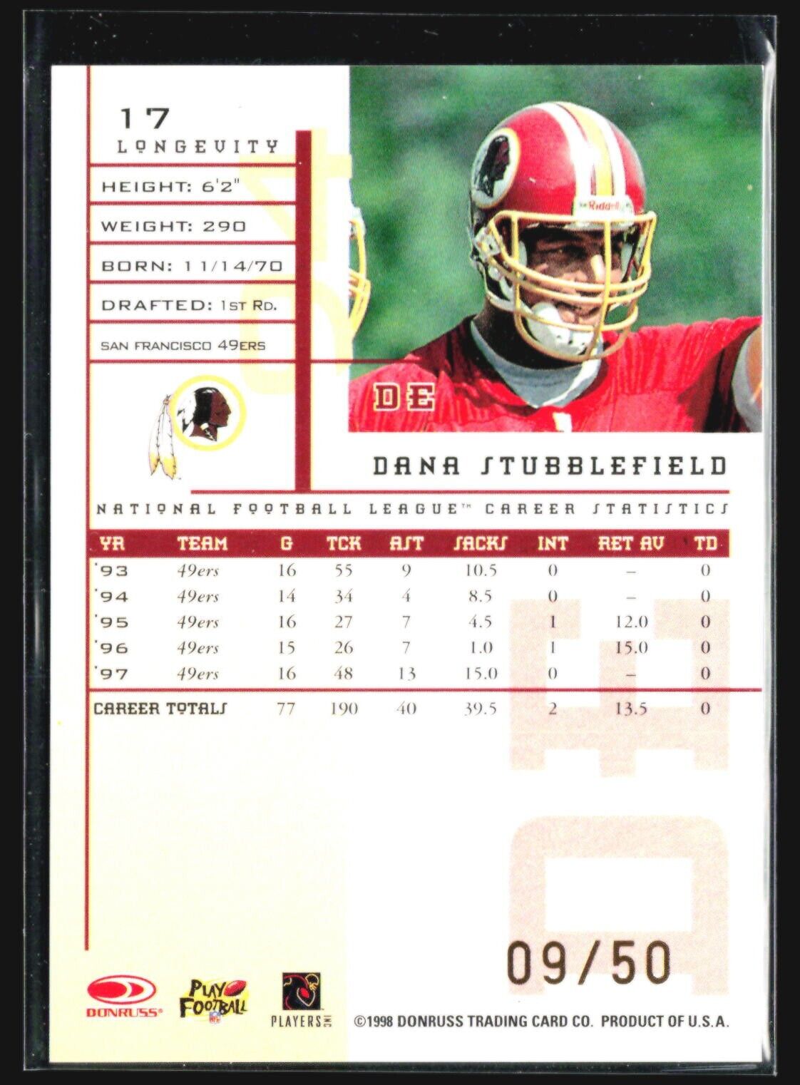 1998 Leaf Rookies & Stars - Longevity #17 Dana Stubblefield /50 Standard Envelope: First 3 items are standard shipping price... Read more