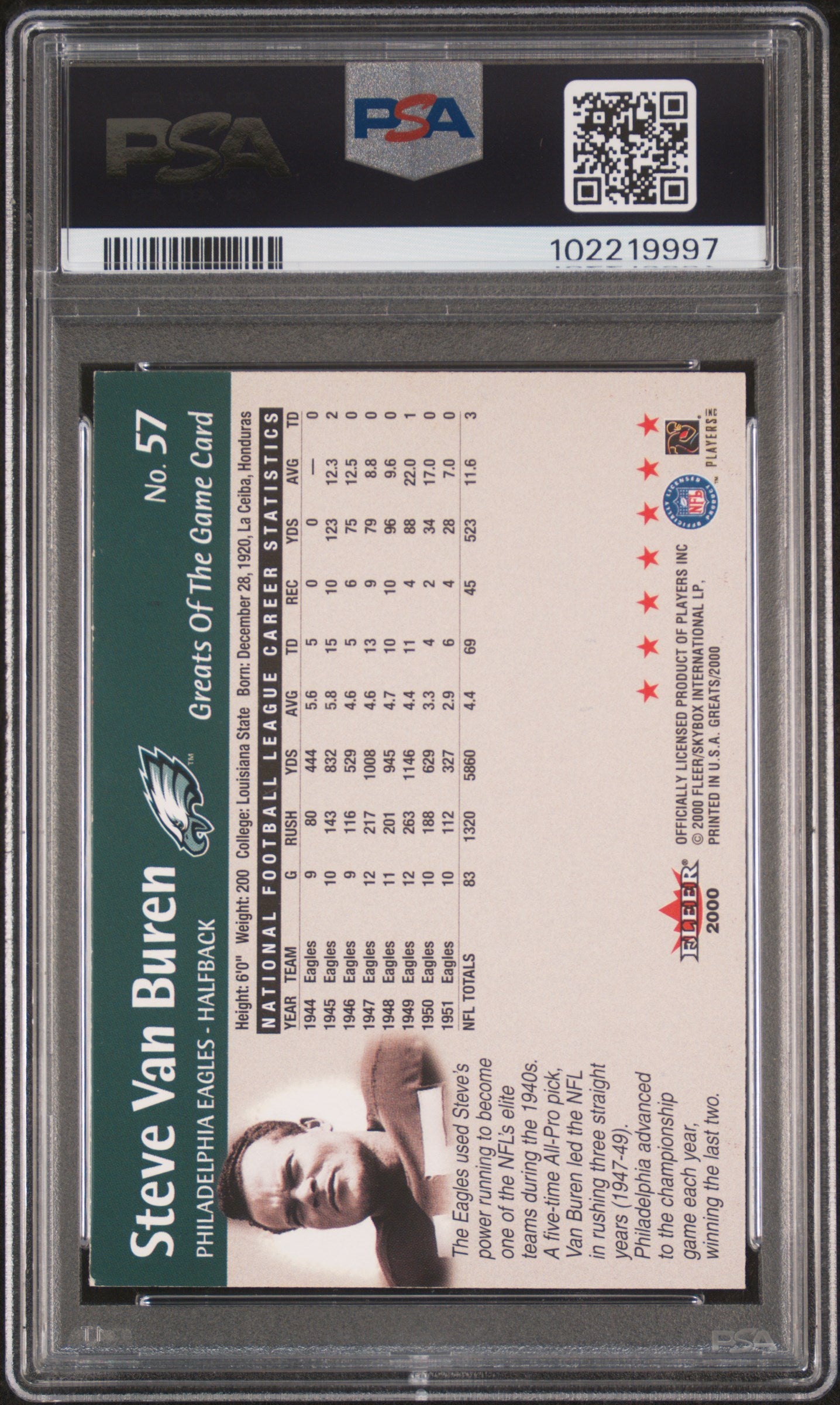 2000 Fleer Greats Of The Game Steve Van Buren #57 PSA 5 Auto 10