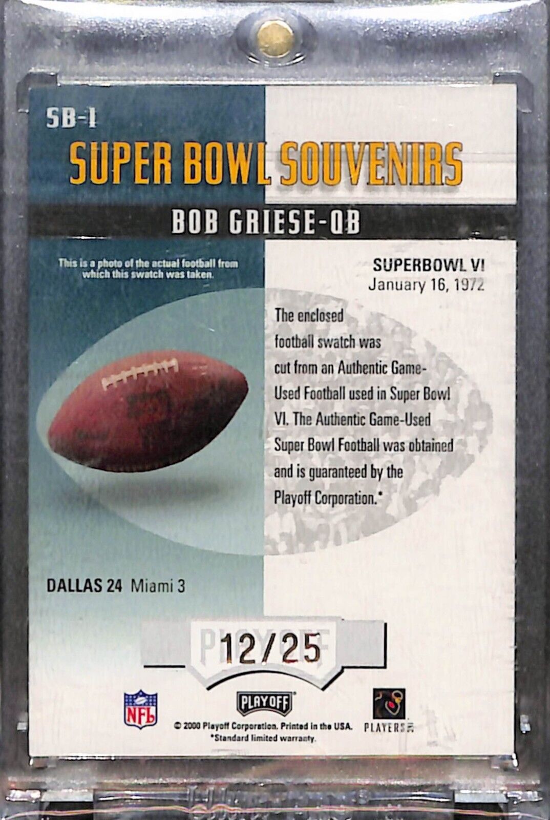 2000 Playoff Super Bowl Souvenirs Bob Griese Game Used Ball Auto /25