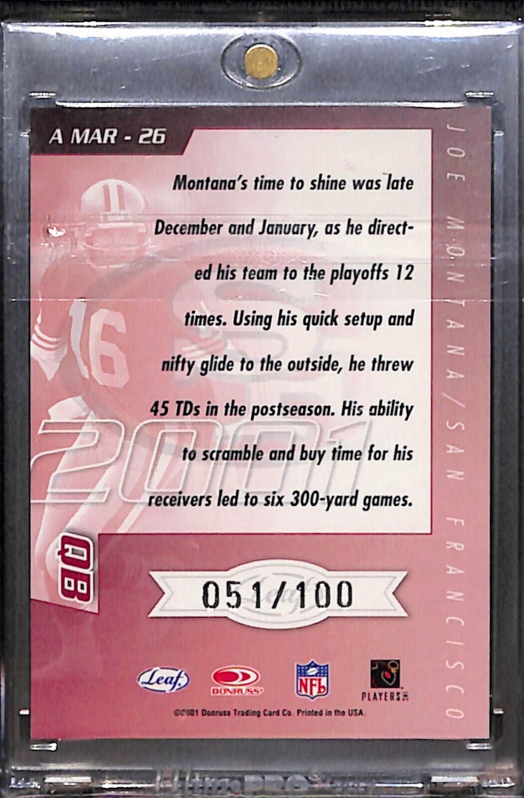 2001 Quantum Leaf - All-Millennium Marks #A MAR - 26 Joe Montana /100 Auto HOF