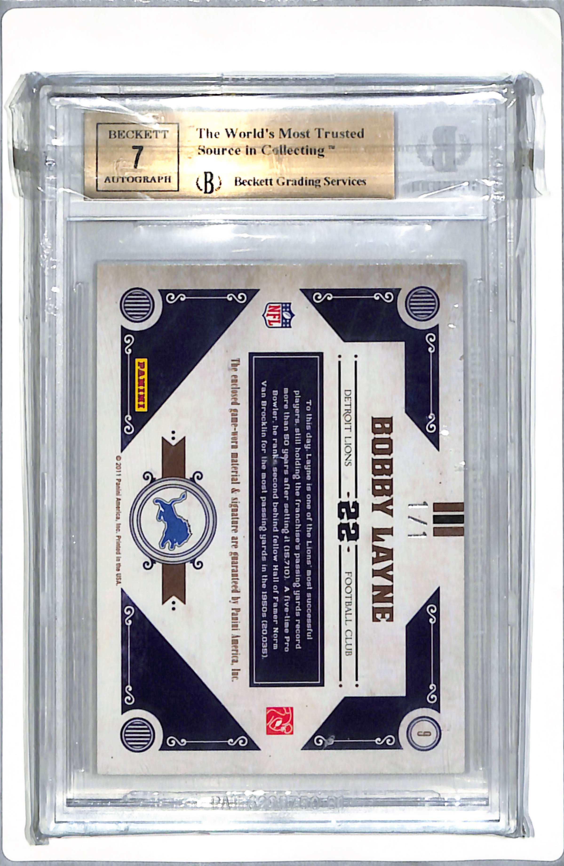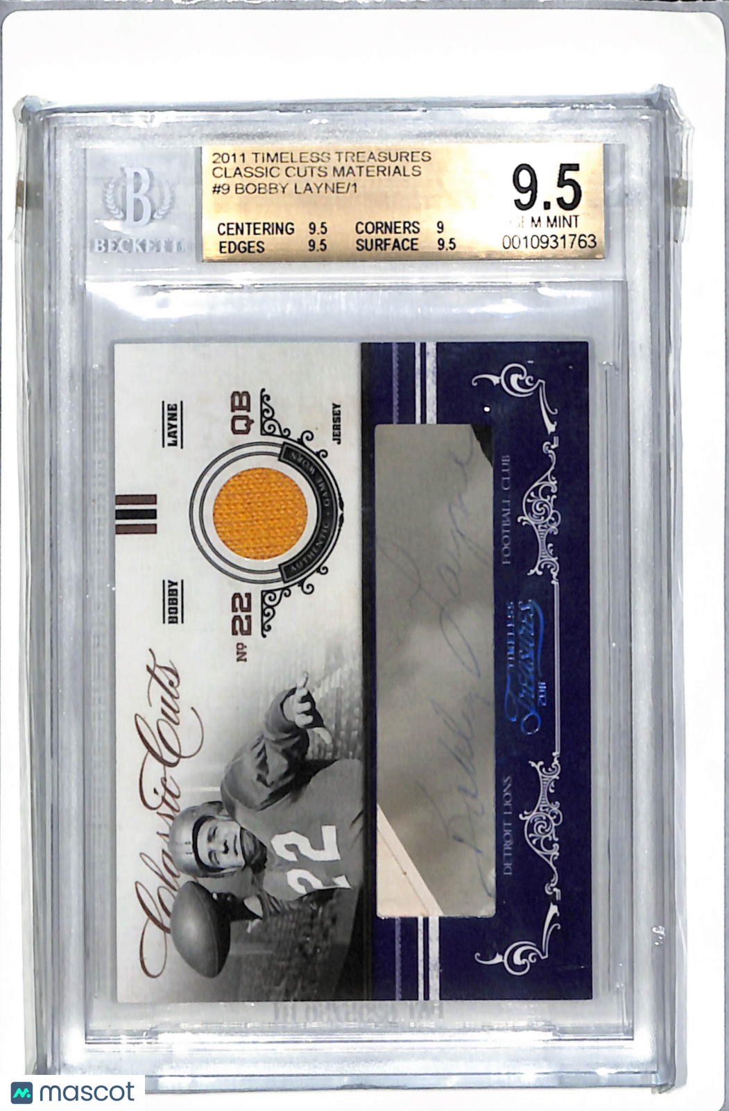2011 Timeless Treasures Classic Cuts Jersey Bobby Layne #9 1/1 BGS 9.5 Auto 7