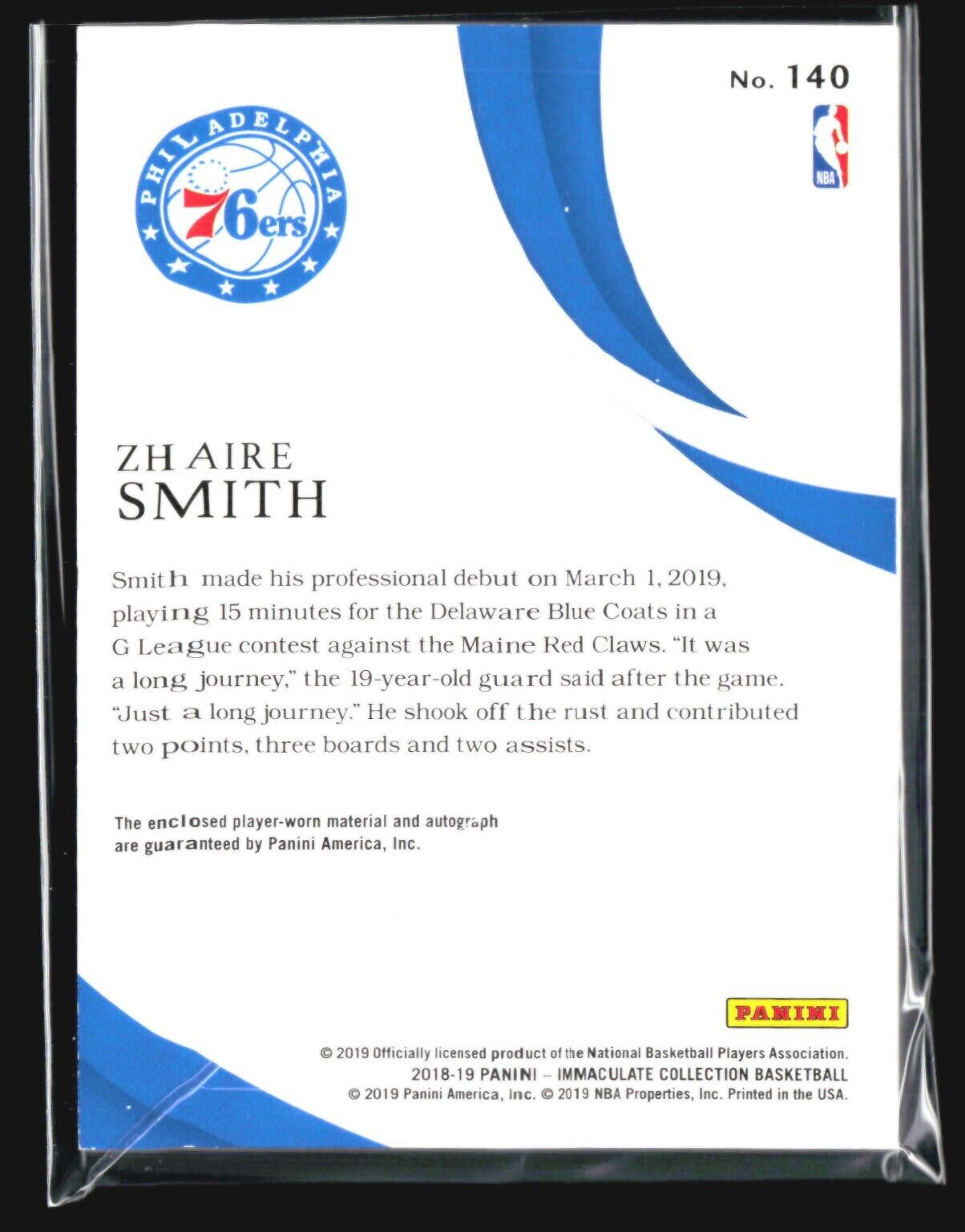 2018-19 Panini Immaculate Rookie Patch Autograph #140 Zhaire Smith /99