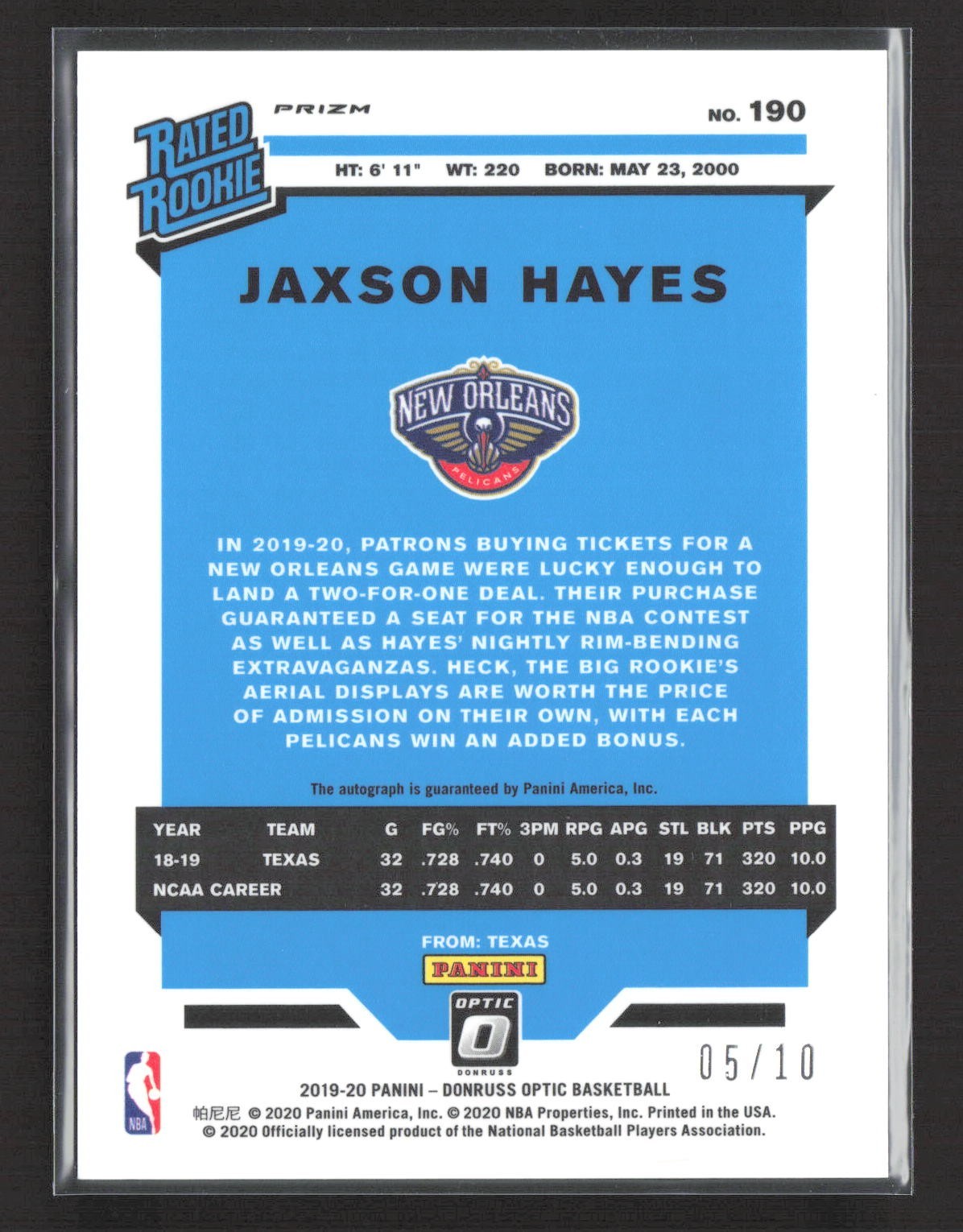 2019-20 Panini Optic Jaxson Hayes Purple Velocity Rated Rookie Auto /10 #190