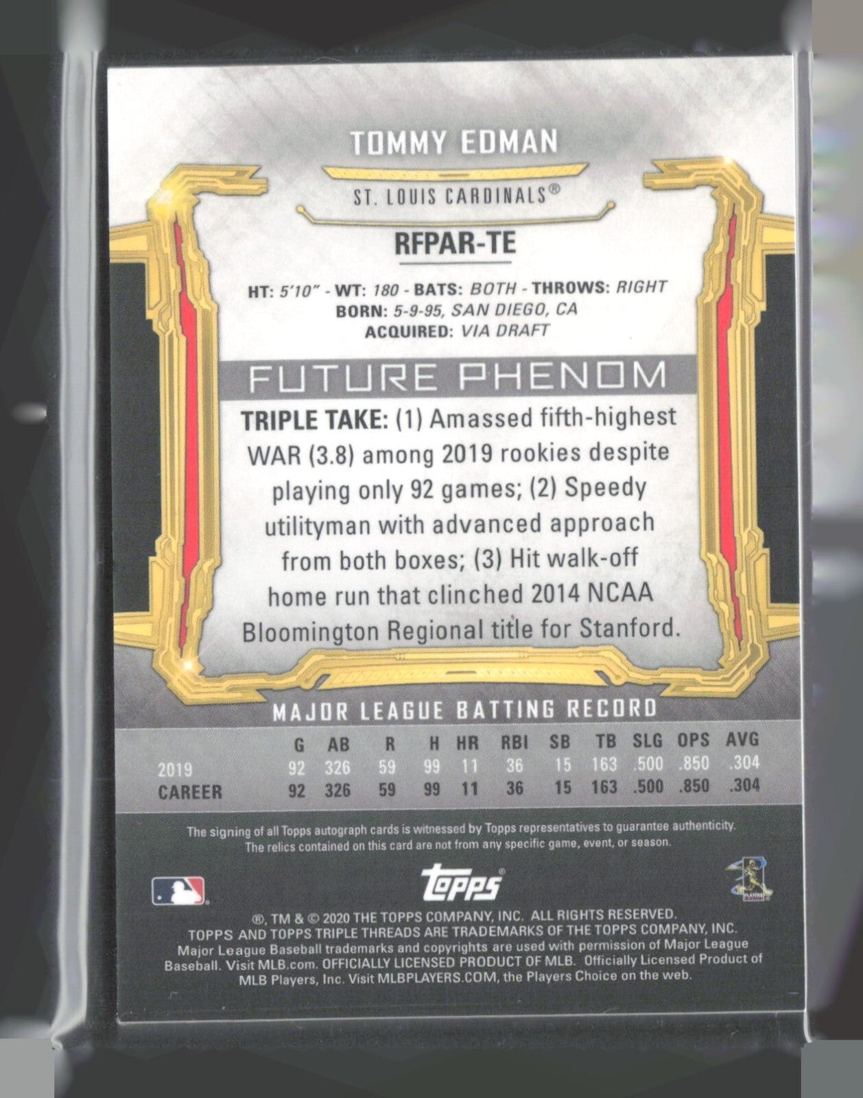 2020 Topps Triple Threads Rookie and Future Phenom Auto Relics Tommy Edman /50