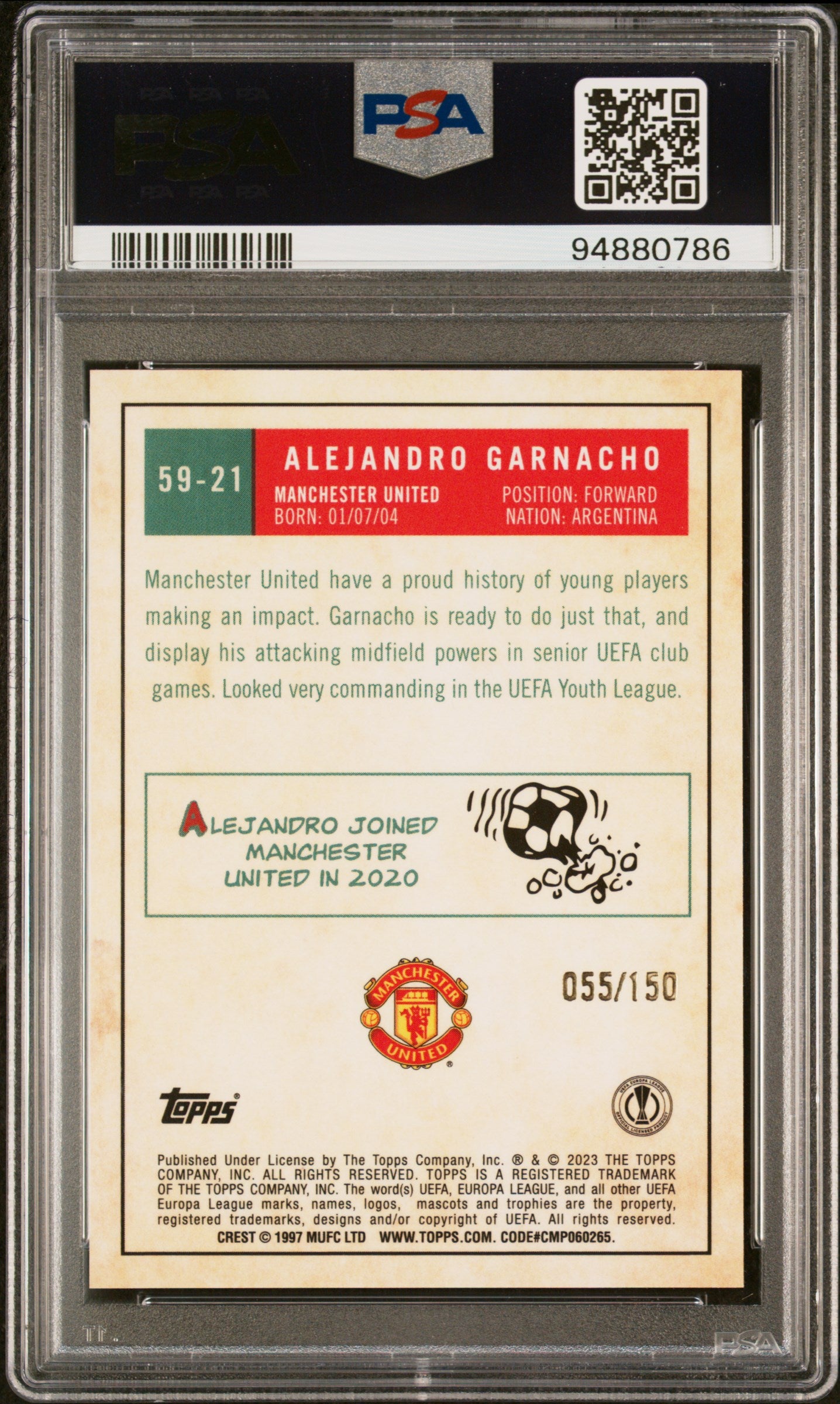 You are purchasing a 2022-23 Topps Chrome UEFA Alejandro Garnacho #59-21 Blue Refractor PSA 9 . Standard Envelope: First 3 items are standard shipping price ($1.71 each), all items after are and additional 50 cents. Max shipping price of $10 USPS Ground: First item standard price, each additional item is 50 cents Raw Card Condition Scale; Near mint or better: Potential Psa 7 or better Excellent: Potential Psa 5 or better Very Good: Potential Psa 3 or better Poor: Potential Psa 1 or better Listed With Mascot.