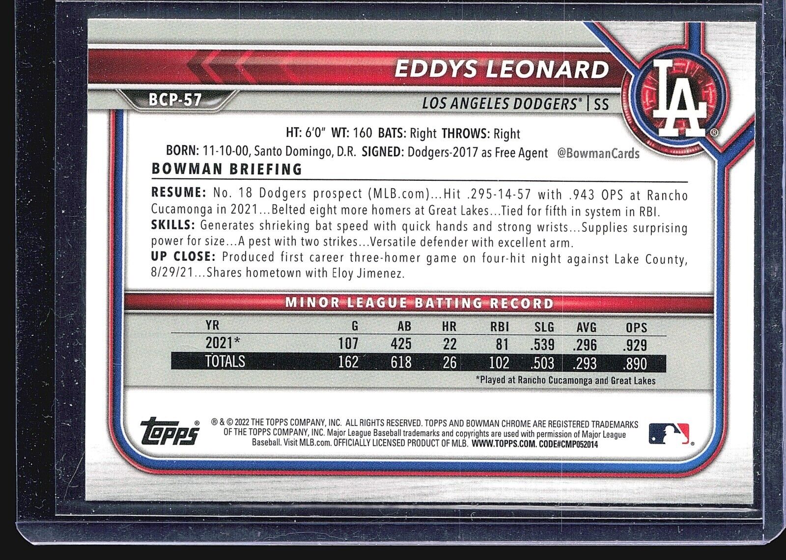 2022 Bowman - Chrome Prospects Mojo Refractor #BCP-57 Eddys Leonard (RC)