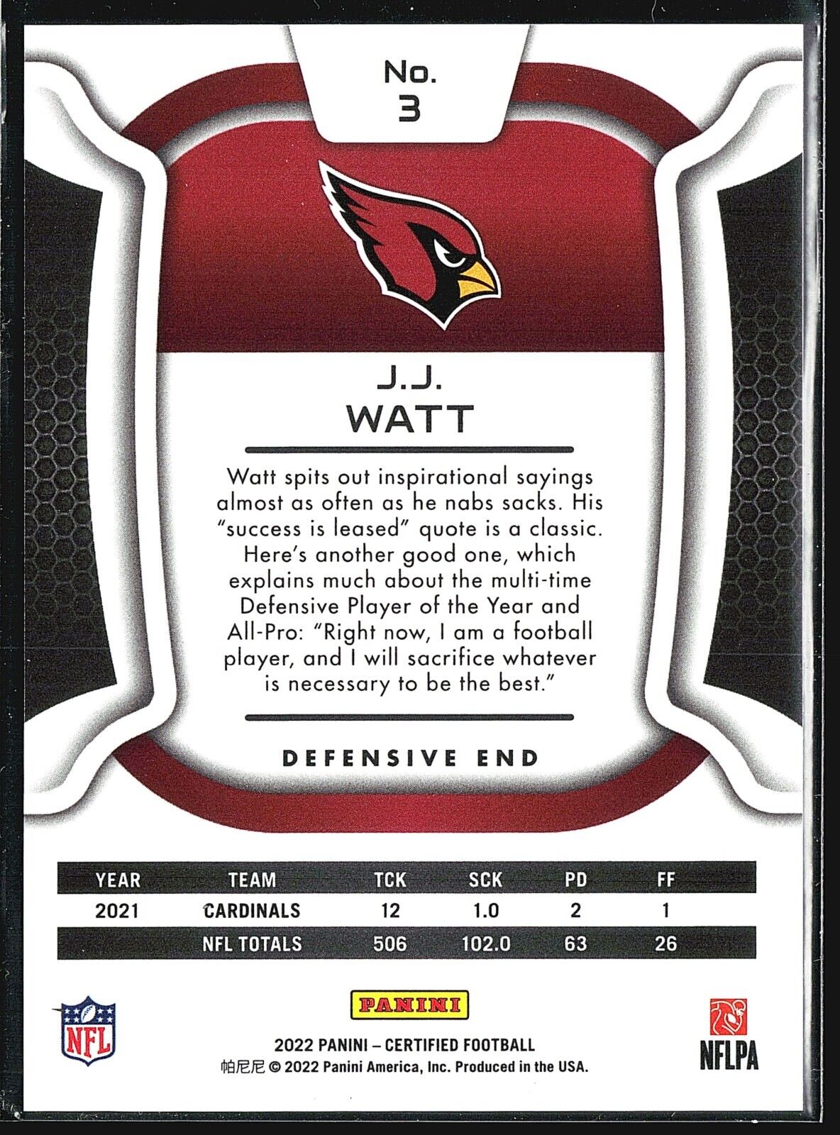 2022 Panini Certified - #3 J.J. Watt Brown /275 VendorPanini Share WhatsApp Deel X Pin it Messenger Email Last stock! Product form 2022 Panini Certified - #3 J.J. Watt Listed With Mascot. Read more 1 in stock Free pickup in our shop(s) Free pickup in our shop(s) $2.00 Quantity Add to cart This item is a recurring or deferred purchase. By continuing, I agree to the cancellation policy and authorize you to charge my payment method at the prices, frequency and dates listed on this page until my order is fulfilled or I cancel, if permitted.