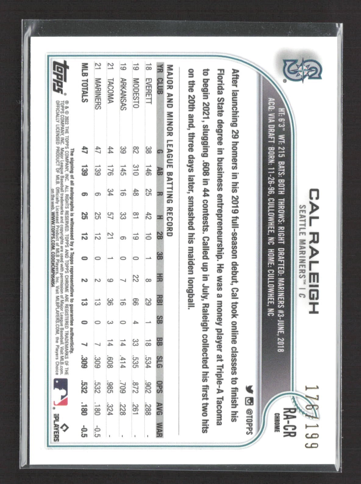 2022 Topps Chrome Rookie Auto Cal Raleigh #RA-CR Aqua Wave Refractor /199 Rc