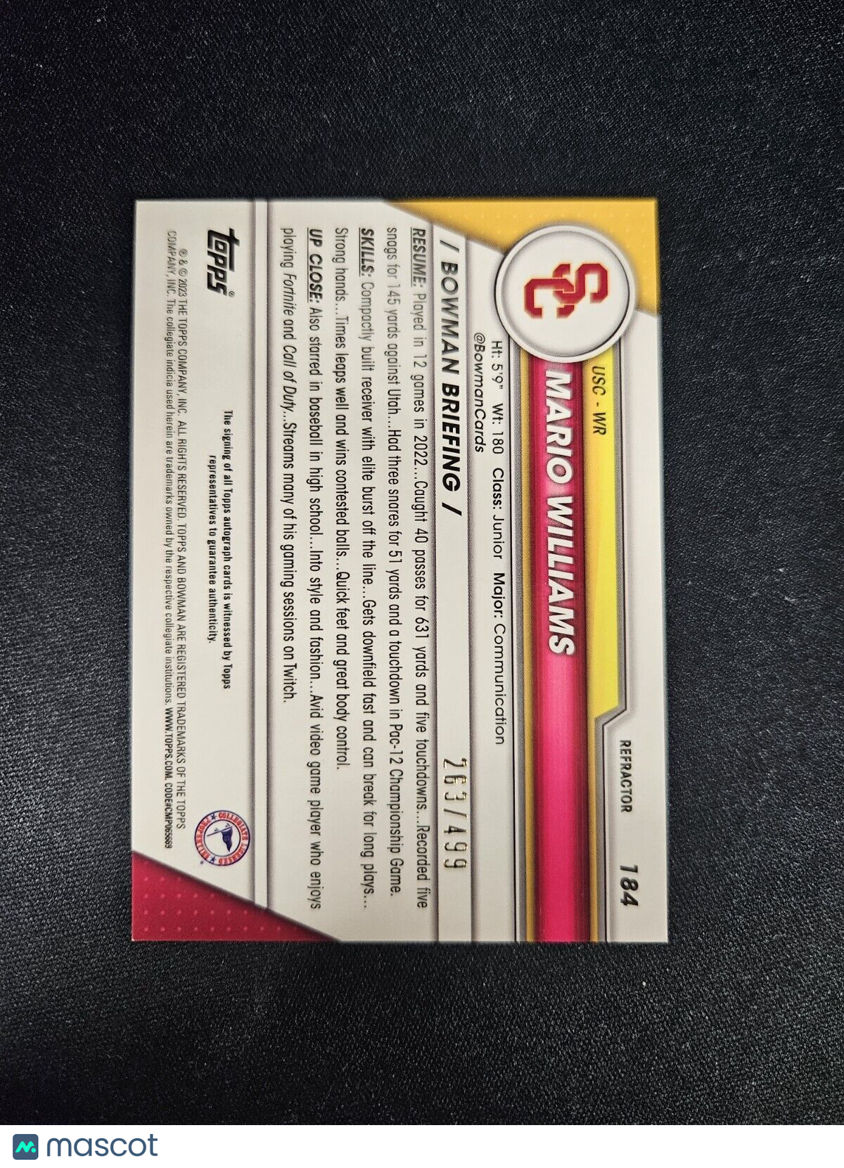 Introducing the 2023 Mario Williams Bowman U Chrome 1st Refractor Auto, numbered #184 out of 499. This rare sports trading... Read more