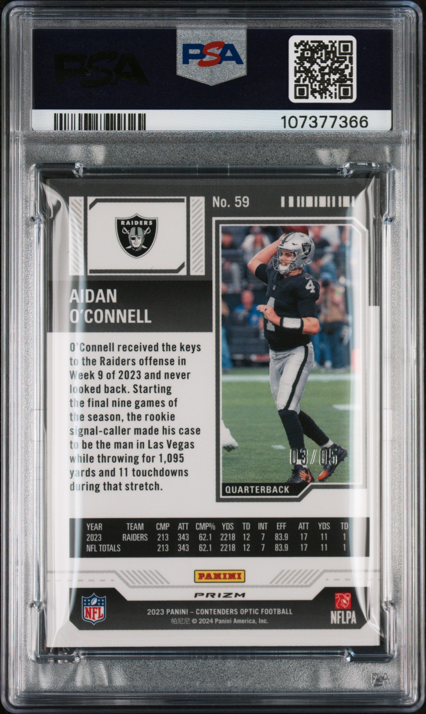 2023 Panini Contenders Optic Aidan O'connell #59 Black Pulsar PSA 8