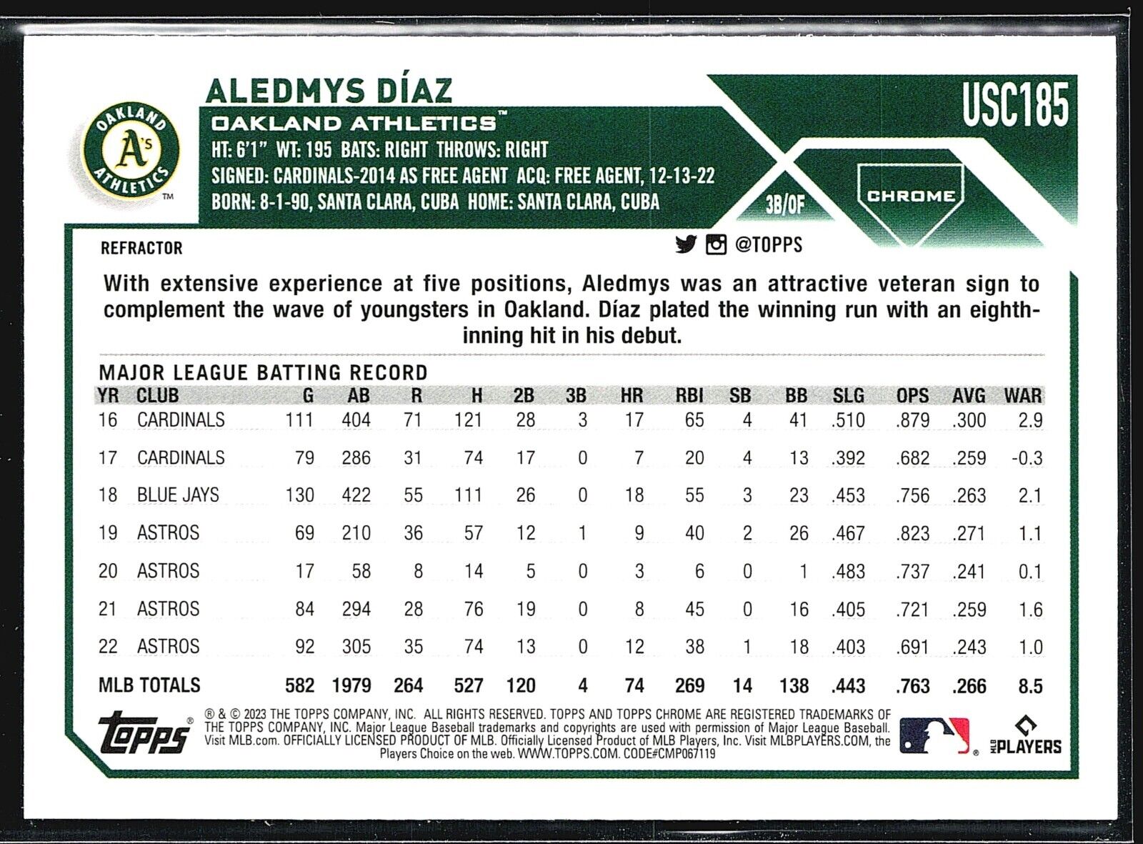 2023 Topps Chrome Update Series - #US118 Aledmys Diaz Refractor VendorTopps Share WhatsApp Deel X Pin it Messenger Email Last stock! Product form 2023 Topps Update Series - #US118 Aledmys Diaz Listed With Mascot. Read more 1 in stock $2.00 Excl. VAT Quantity Add to cart This item is a recurring or deferred purchase. By continuing, I agree to the cancellation policy and authorize you to charge my payment method at the prices, frequency and dates listed on this page until my order is fulfilled or I cancel, if permitted.