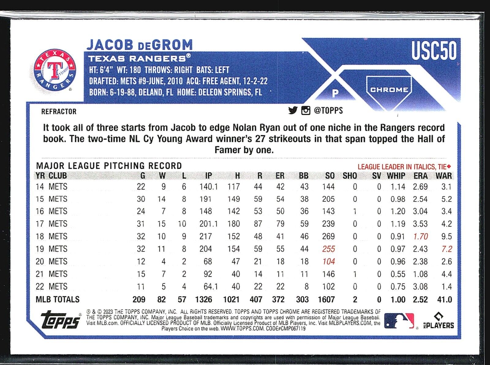 Reviews 2023 Topps Chrome Update Series - #USC50 Jacob deGrom Refractor 0 out of 5 stars This product has no reviews yet Write a review Write a review