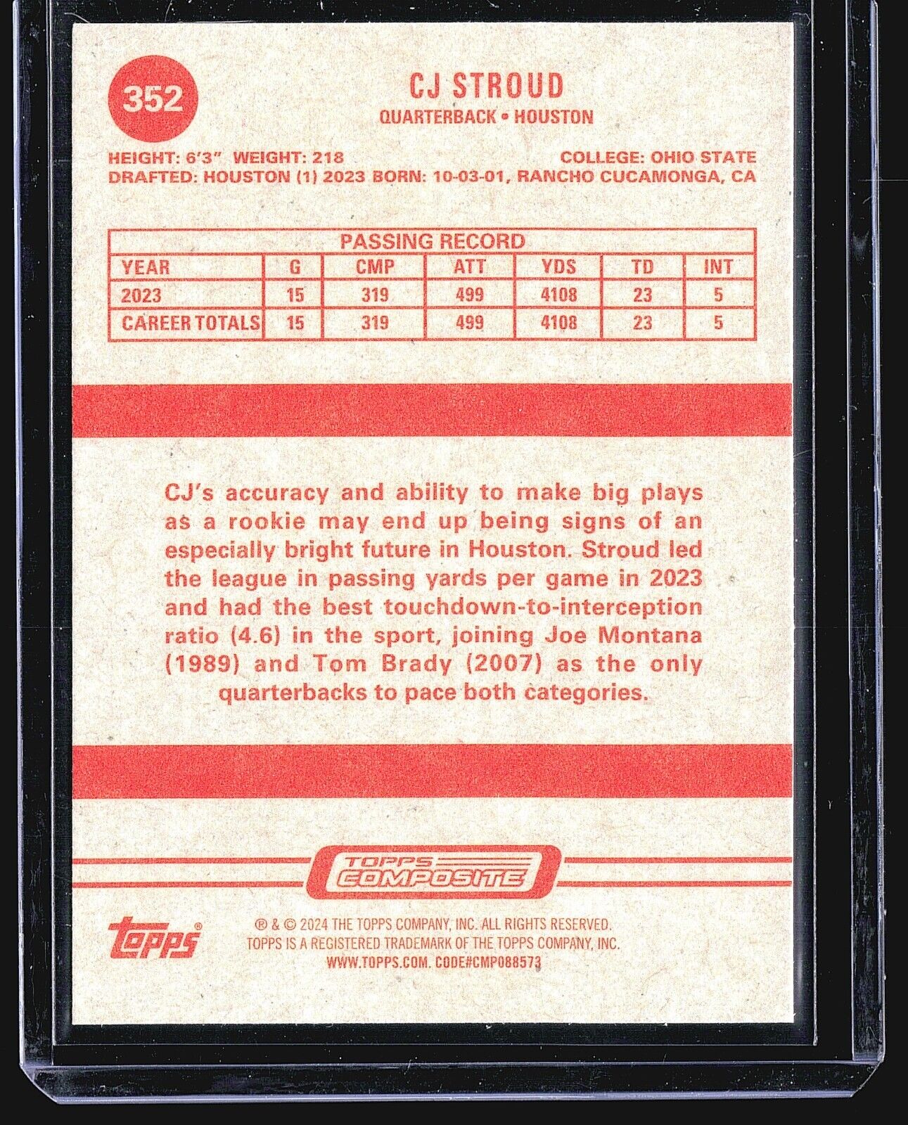 You are purchasing a 2023 Topps Composite C. J. Stroud #352 . You will receive the exact card in the... Read more