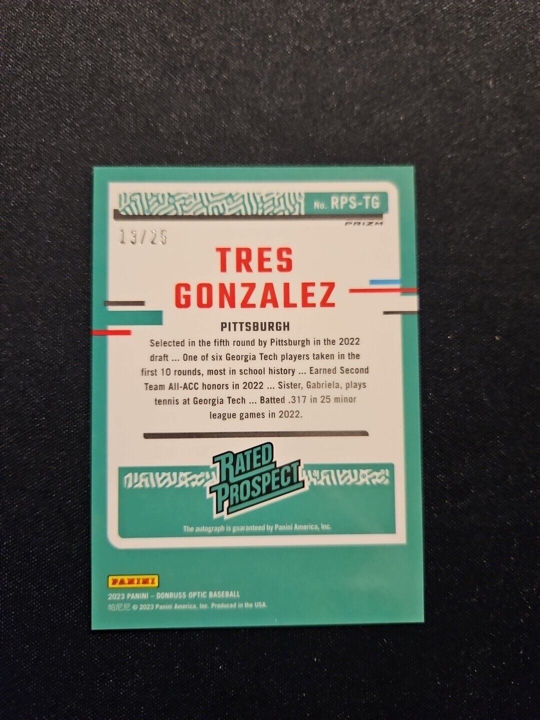 This 2023 Tres Gonzalez Optic Red Rated Prospect Auto /25 card is an absolute must-have for any Pittsburgh Pirates fan... Read more