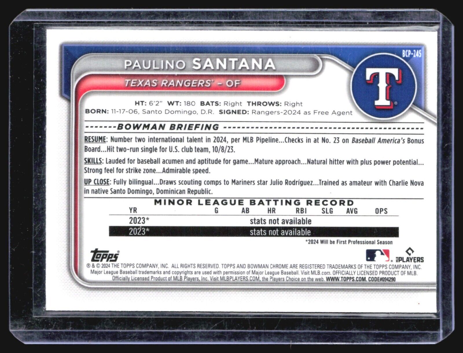 You are purchasing a 2024 Bowman Chrome Paulino Santana #BCP-245. You will receive the exact card in the photographs. Thank... Read more