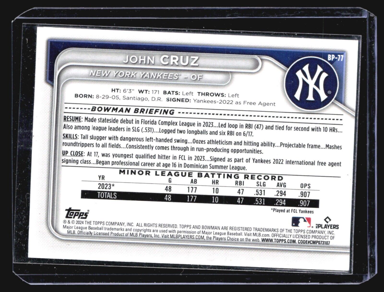 You are purchasing a 2024 Bowman John Cruz #BP-77. You will receive the exact card in the photographs. Thank you... Read more