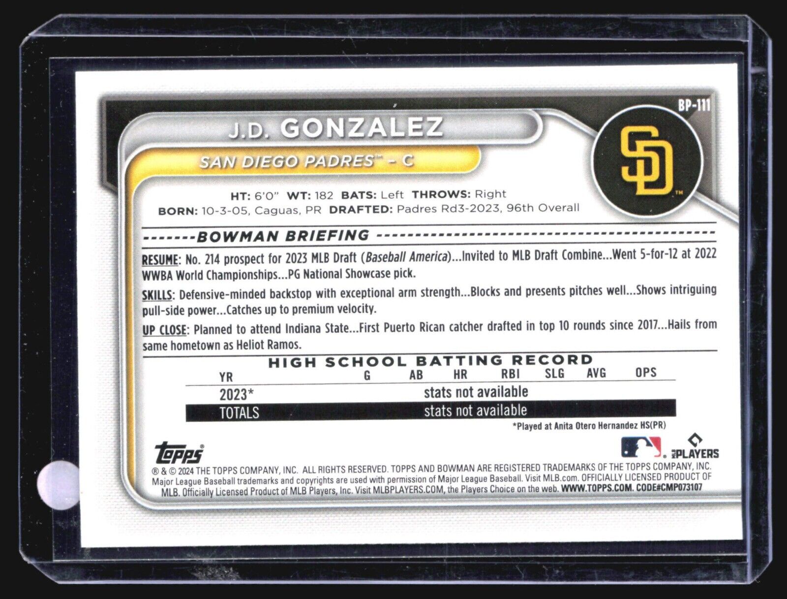 You are purchasing a 2024 Bowman J.D. Gonzalez #BP-111. You will receive the exact card in the photographs. Thank you... Read more