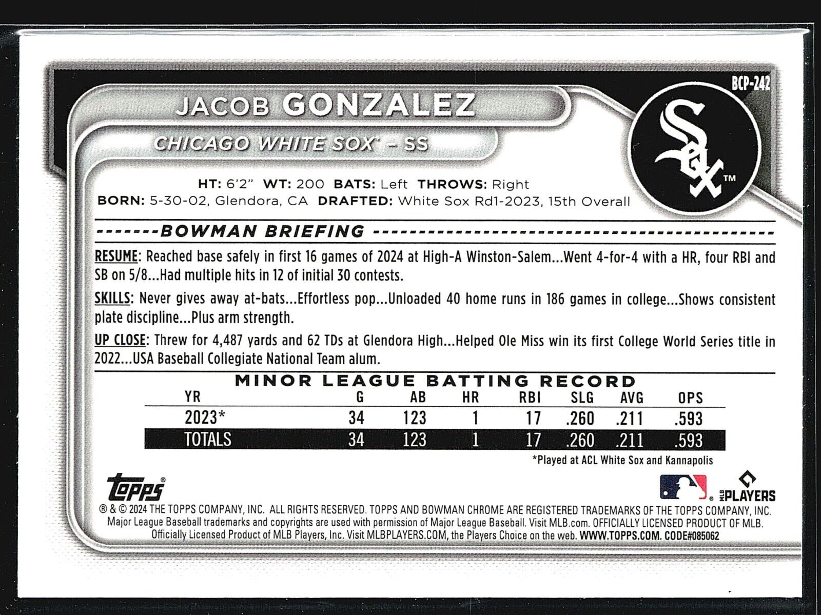 You are purchasing a 2024 Bowman Chrome Jacob Gonzalez #BCP-242 . You will receive the exact card in the photographs.... Read more