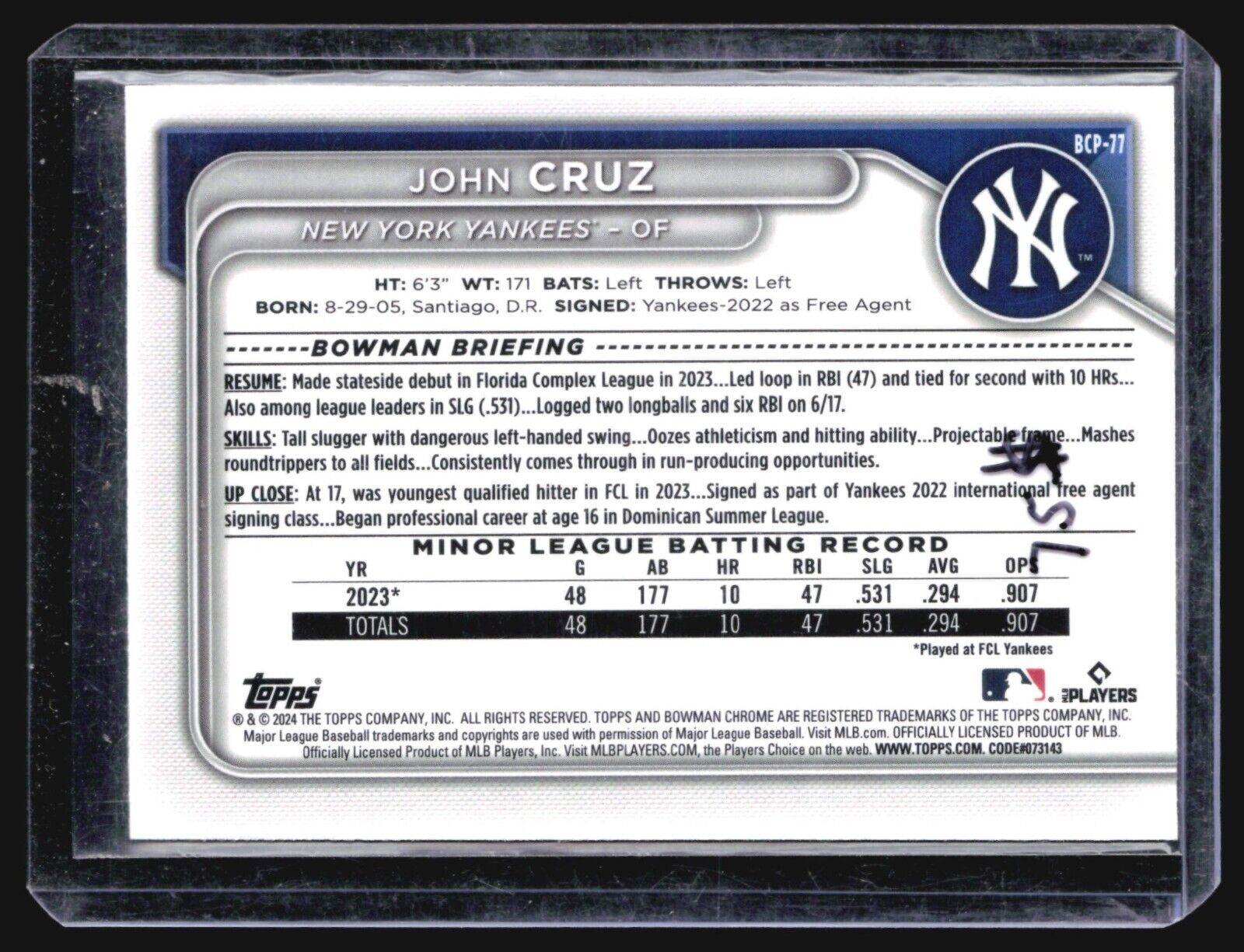 2024 Bowman Chrome 1st Fuschia /199 John Cruz #BCP-77