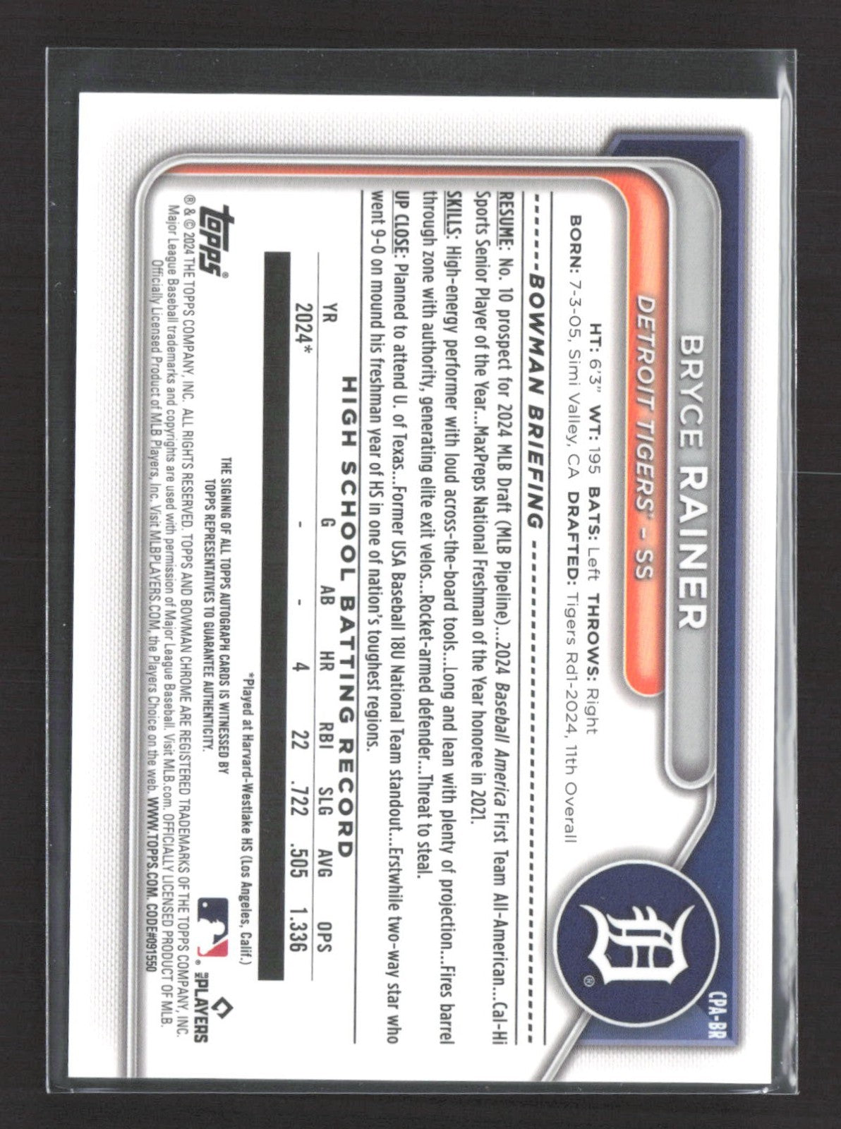2024 Bowman Chrome Bryce Rainer 1st Auto #CPA-BR