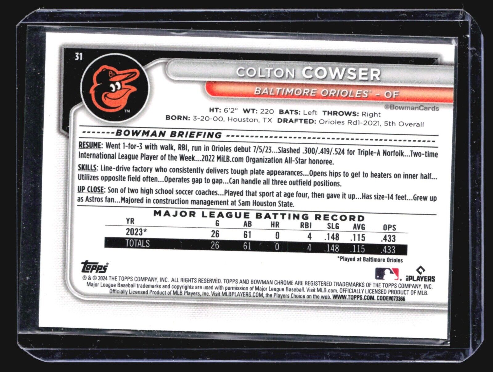You are purchasing a 2024 Bowman Colton Cowser #31. You will receive the exact card in the photographs. Thank you... Read more