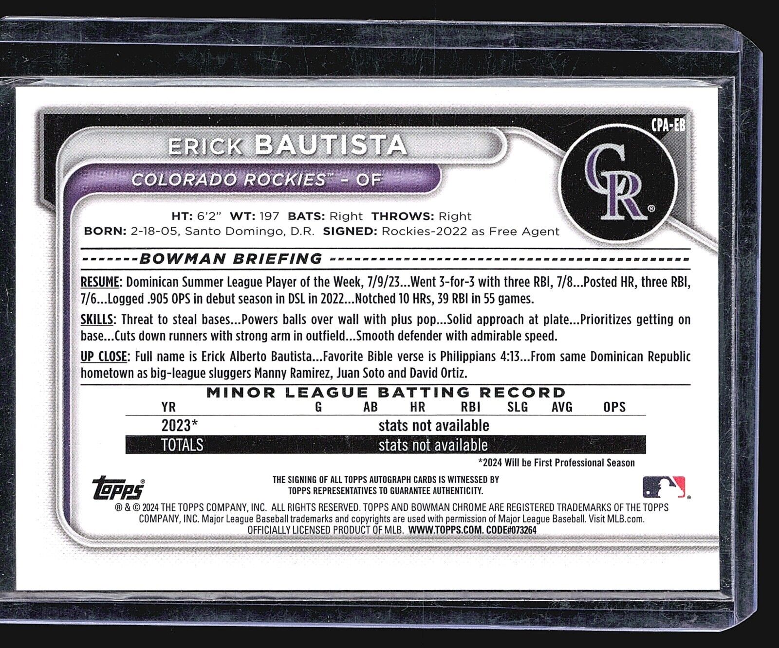 2024 Bowman - Chrome Prospect Autographs #CPA-EB Erick Bautista (AU, RC) Listed With Mascot. Read more