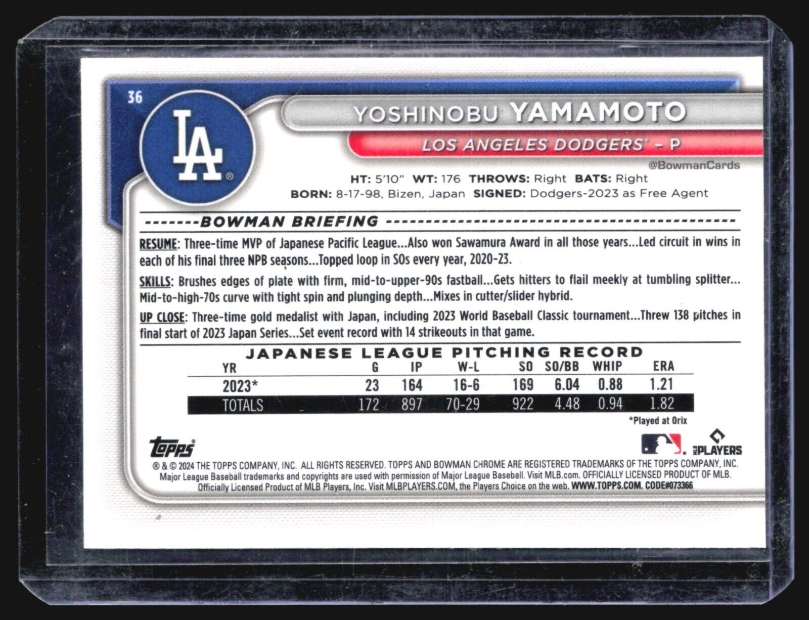 You are purchasing a 2024 Bowman Yoshinobu Yamamoto #36. You will receive the exact card in the photographs. Thank you... Read more