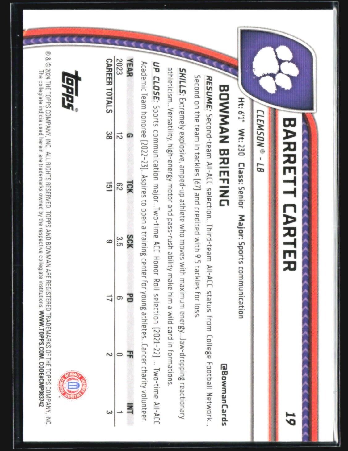 2024 Bowman Chrome U Barrett Carter 1st purple /399 #19