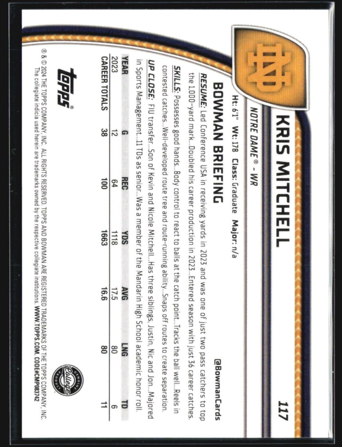 2024 Bowman Chrome U Kris Mitchell 1st Pink /150 #117