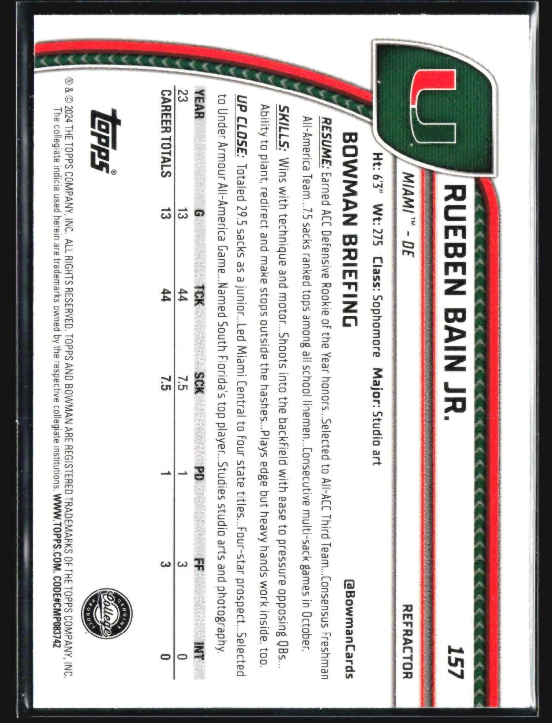 2024 Bowman Chrome U Rueben Bain Jr 1st Refractor #157