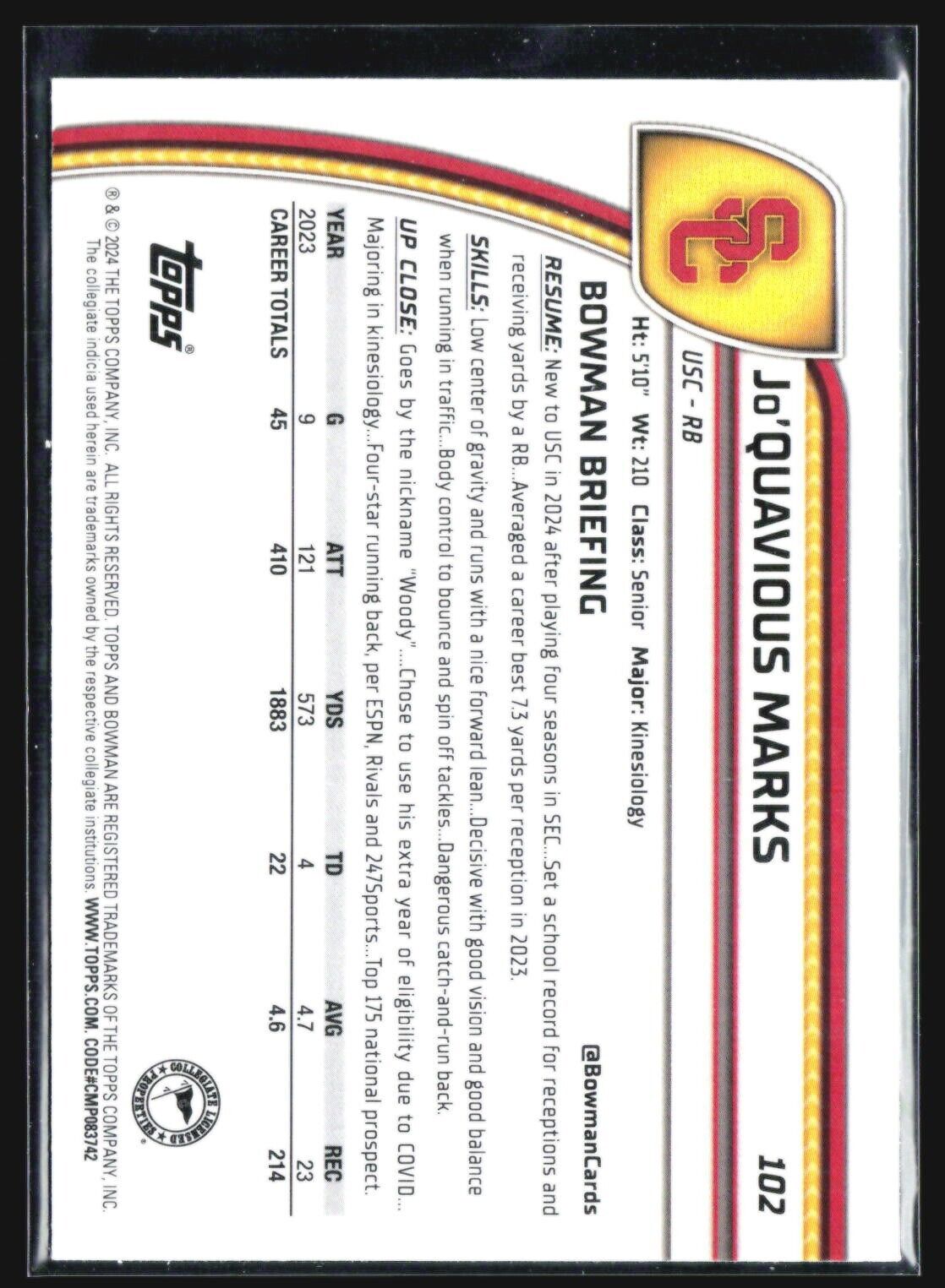 2024 Bowman University Chrome - #102 Jo'Quavious Marks (RC) Sapphire