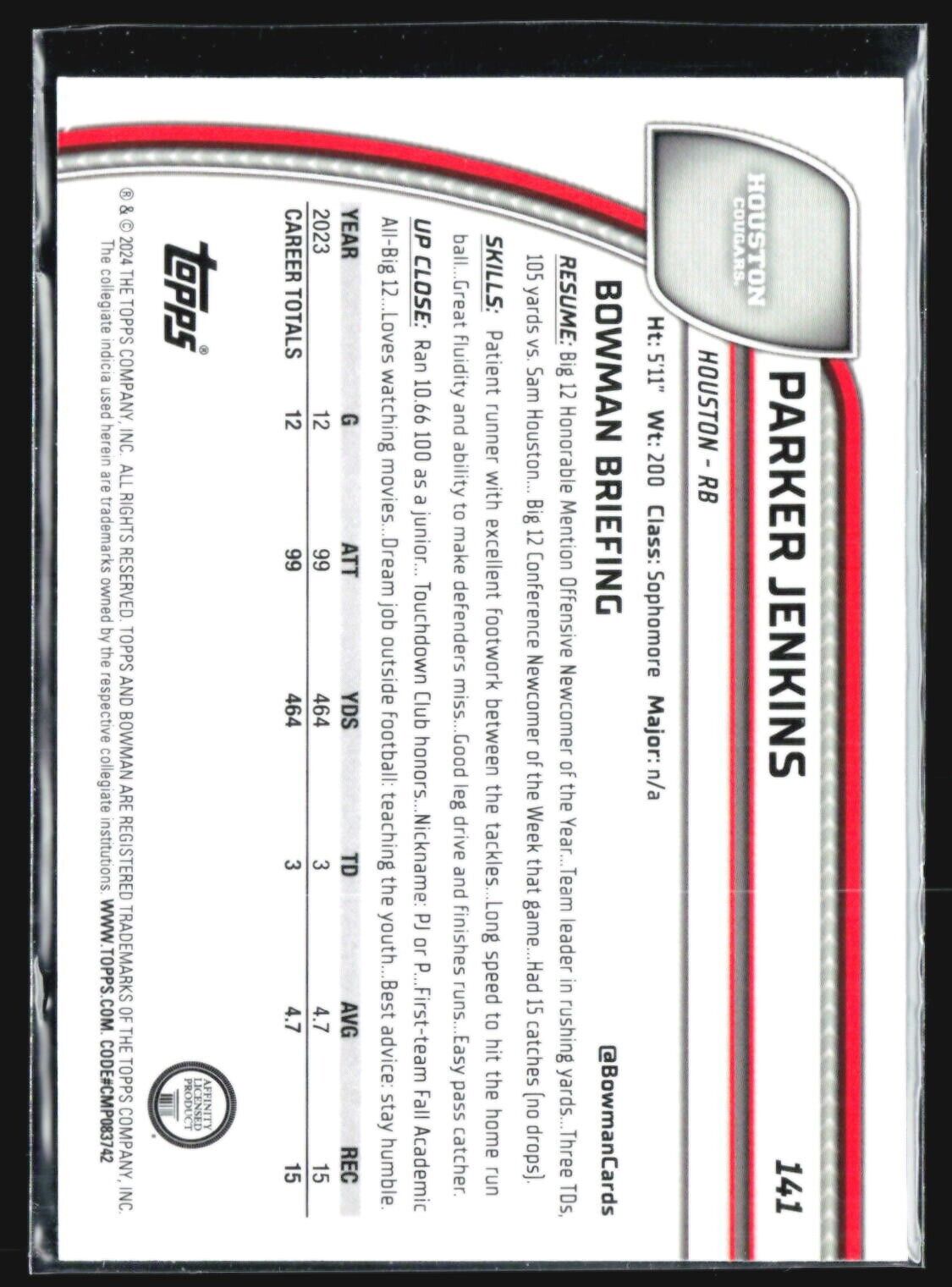 2024 Bowman University Chrome - #141 Parker Jenkins (RC) Purple Shimmer
