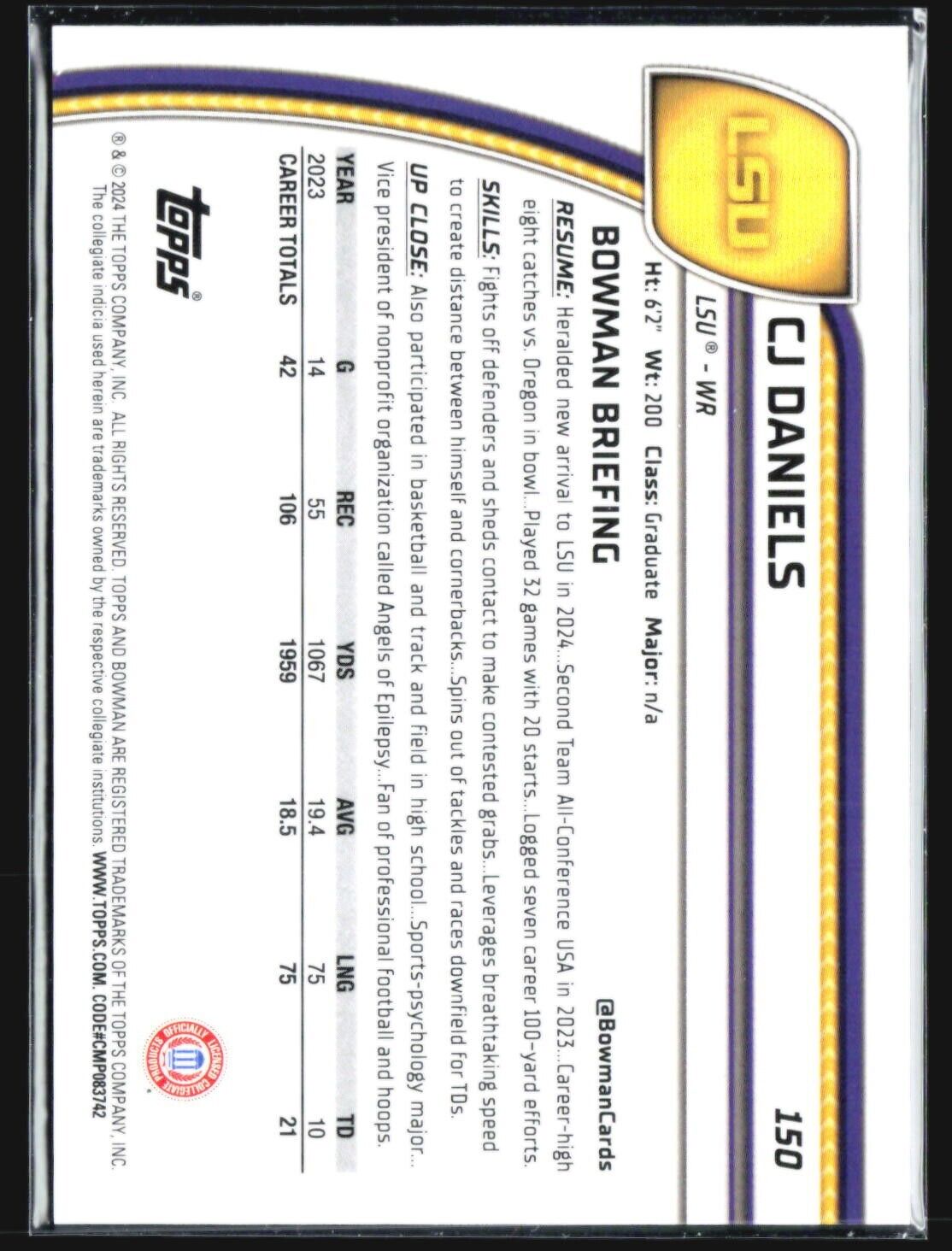 2024 Bowman University Chrome - #150 CJ Daniels (RC) Purple Speckle /375