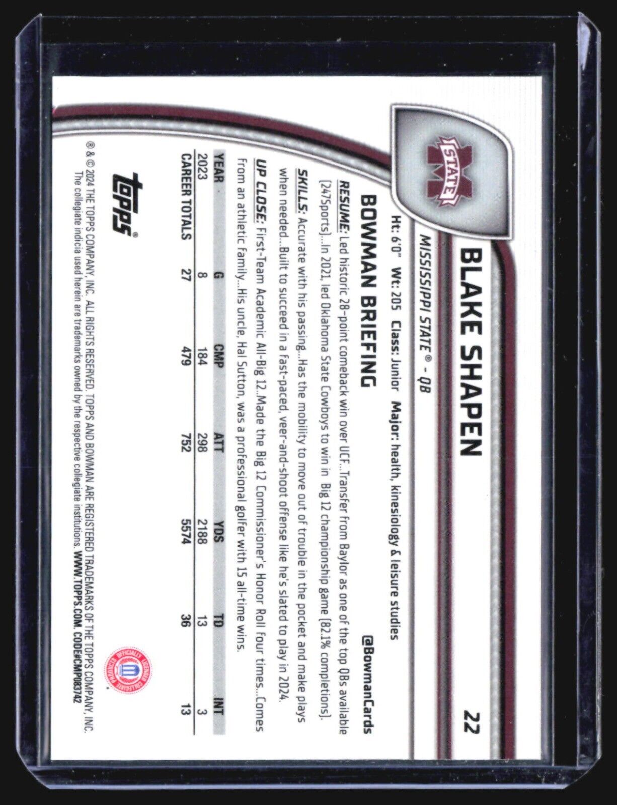 2024 Bowman University Chrome - #22 Blake Shapen (RC) Pink Refractor /150