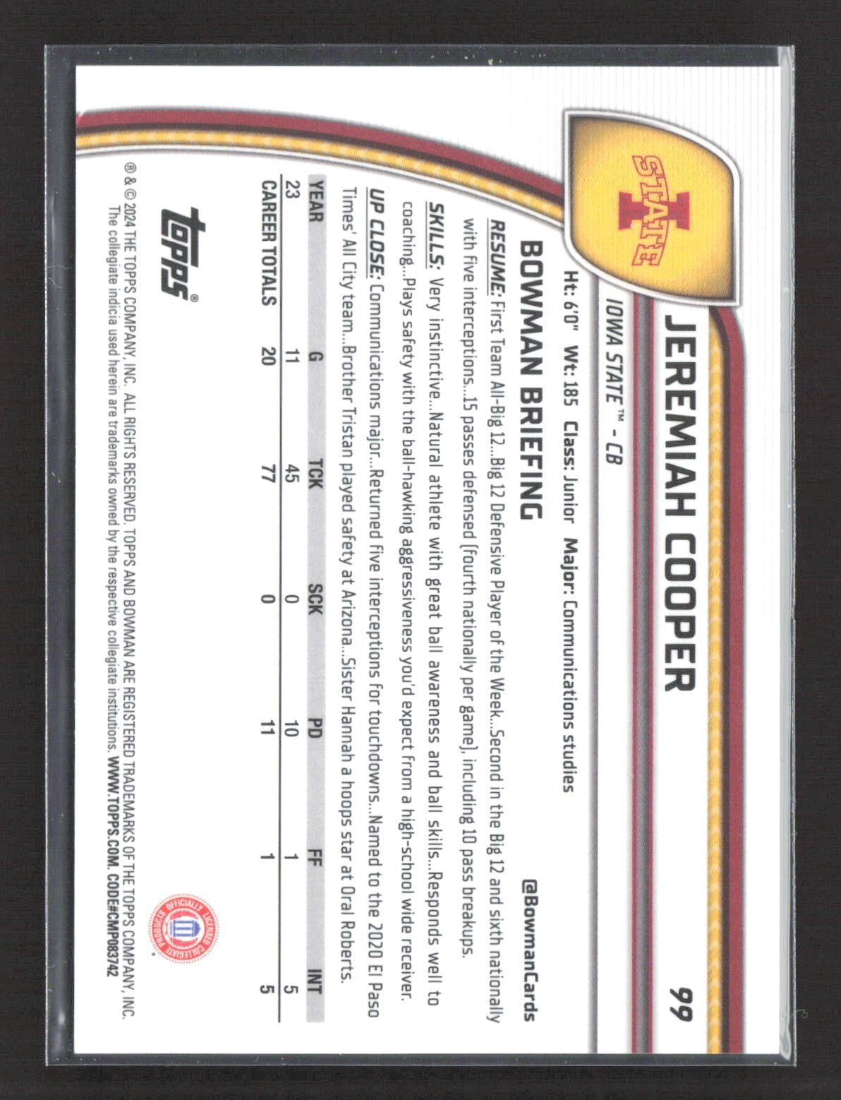 2024 Bowman University Chrome Jeremiah Cooper 1st Blue Refractor /199 #99