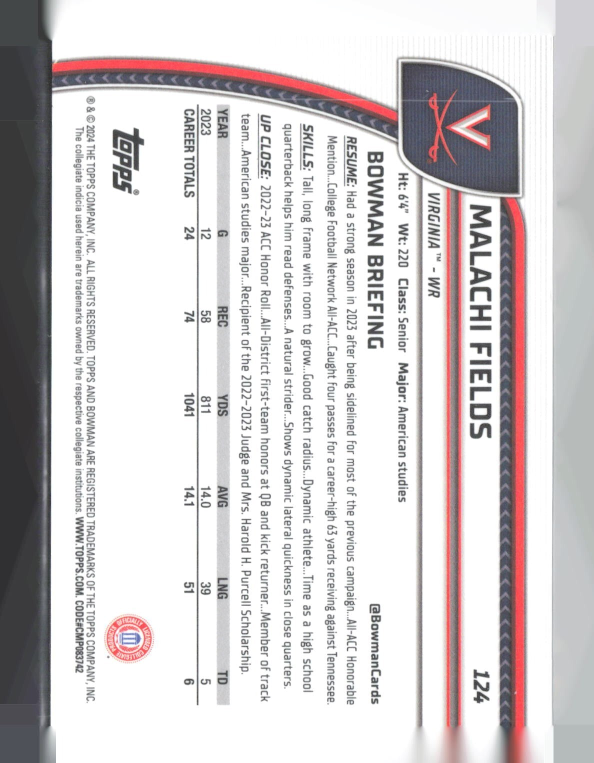 2024 Bowman University Chrome Malachi Fields 1st Black & White Stealth /48 #124