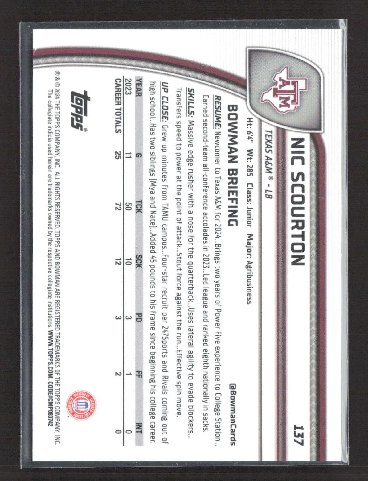 2024 Bowman University Chrome Nic Scourton 1st Aqua Refractor /299 #137