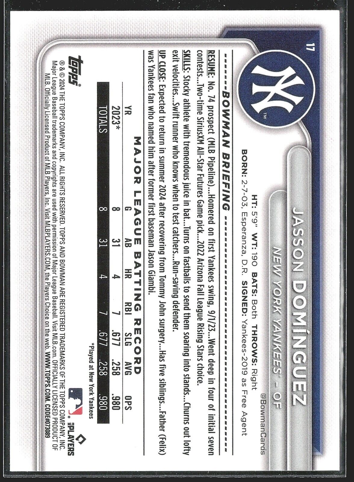 2024 Jasson Dominguez Bowman Paper Rc Rookie #17 Yankees