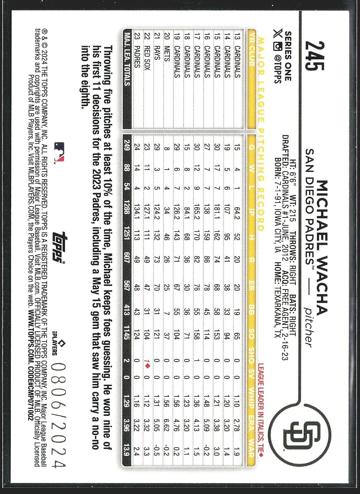 2024 Michael Wacha Topps Series 1 Gold /2024 #245 padres