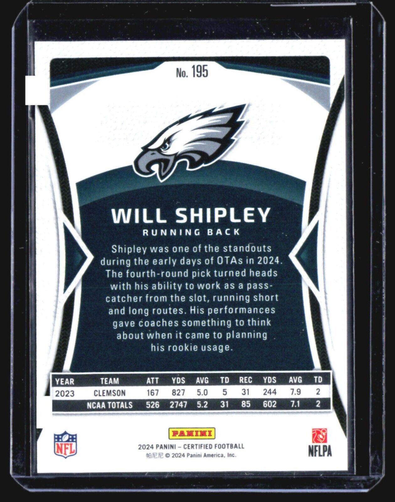 You are purchasing a 2023 Panini Certified Will Shipley Rookie. You will receive the exact card in the photographs. Thank... Read more