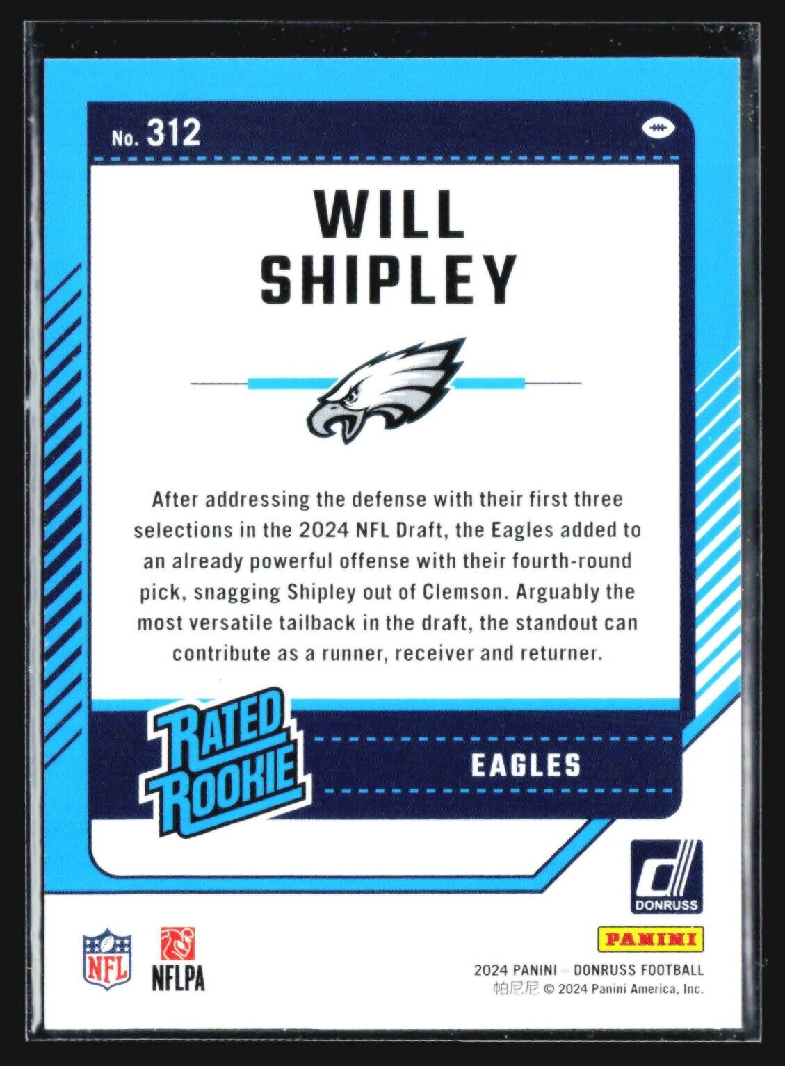 2024 Panini Donruss - Rated Rookie #312 Will Shipley (RC) YPC Press Proof /500