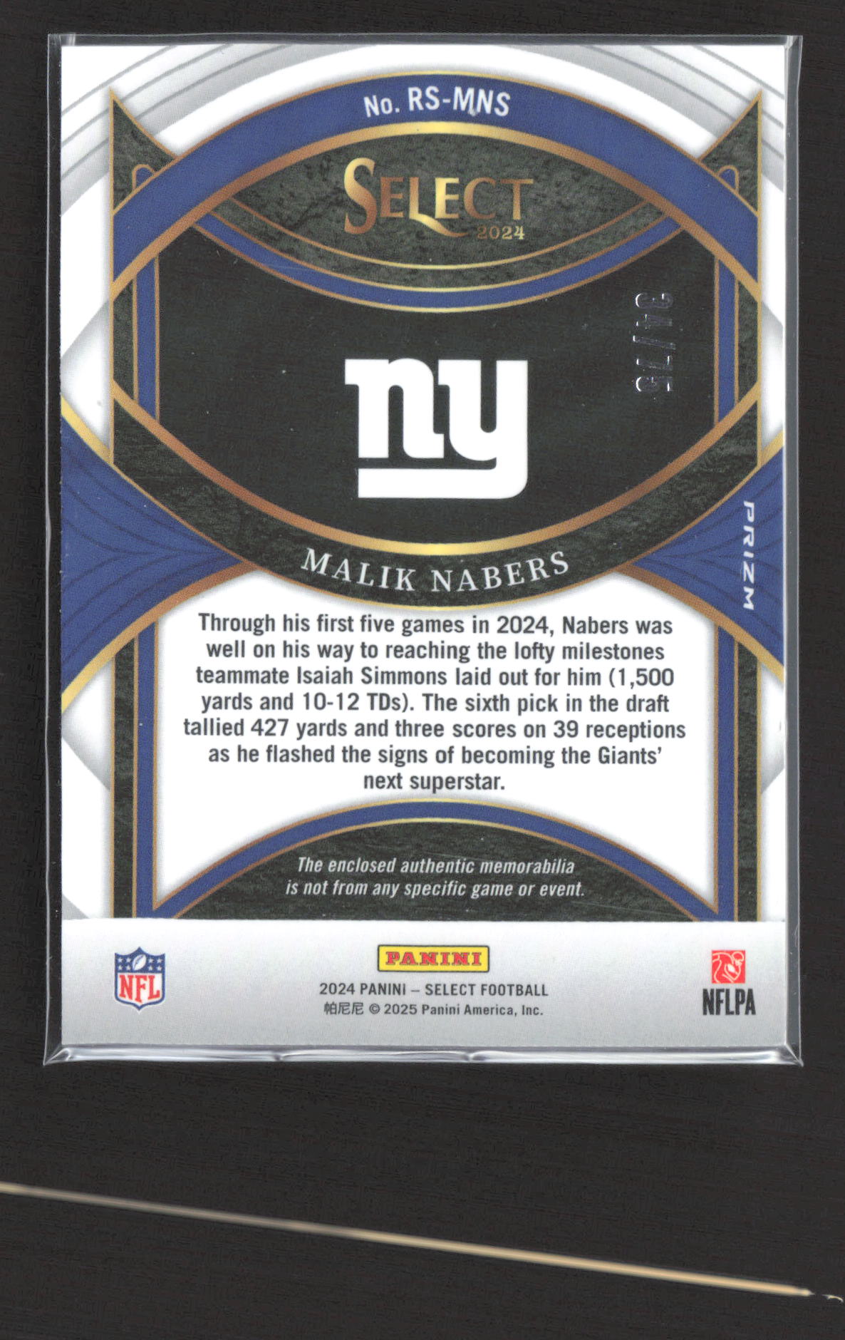 You are purchasing a 2024 Panini Select Malik Nabers #RS-MNS Jersey Patch RC 34/75. You will receive the exact item... Read more