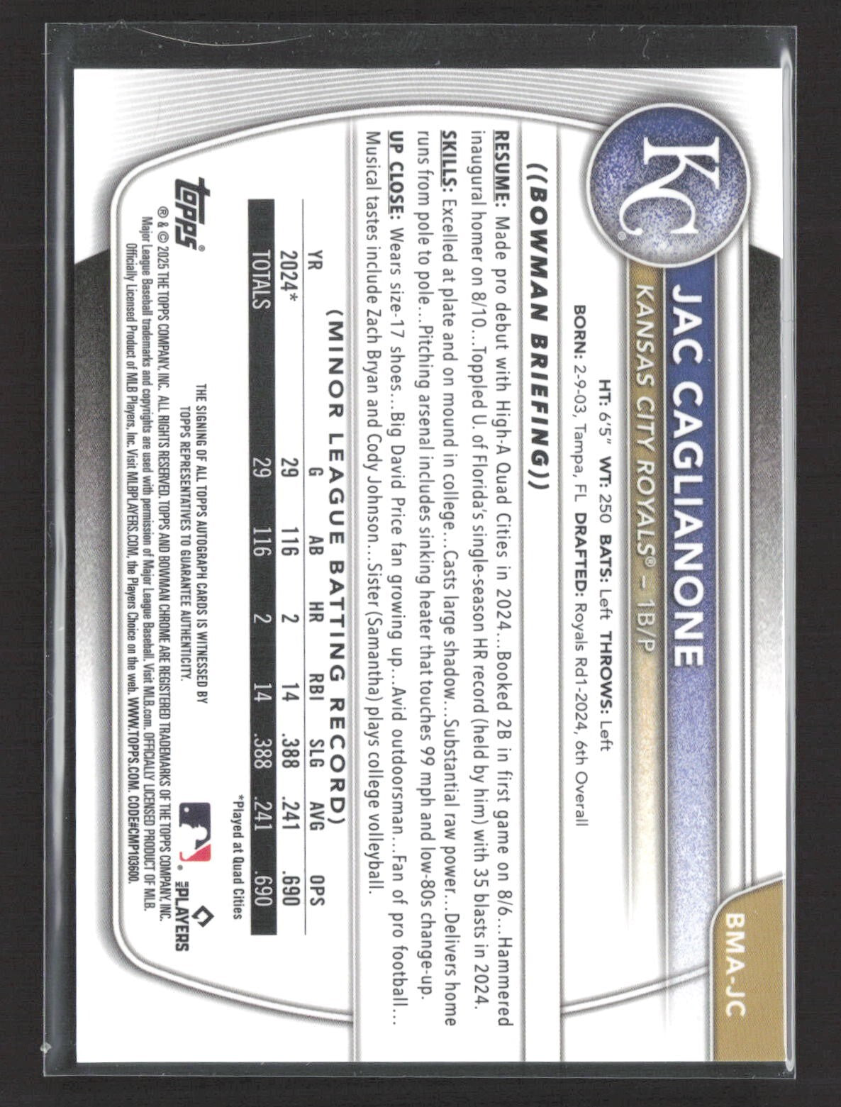 2025 Bowman Chrome Jac Caglianone #BCP-103 (RC) Purple Mojo Auto /199