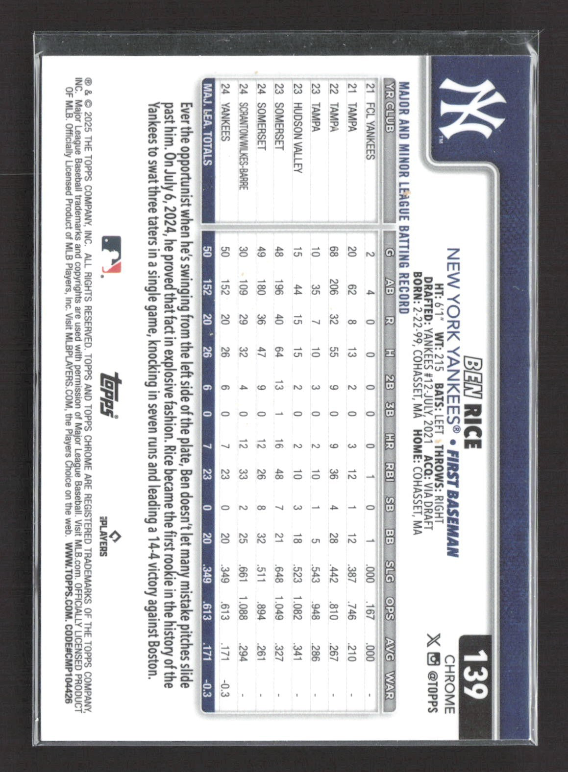 2025 Topps Chrome - Ben Rice #139 Blue Refractor /150 (RC) Listed With Mascot. Read more