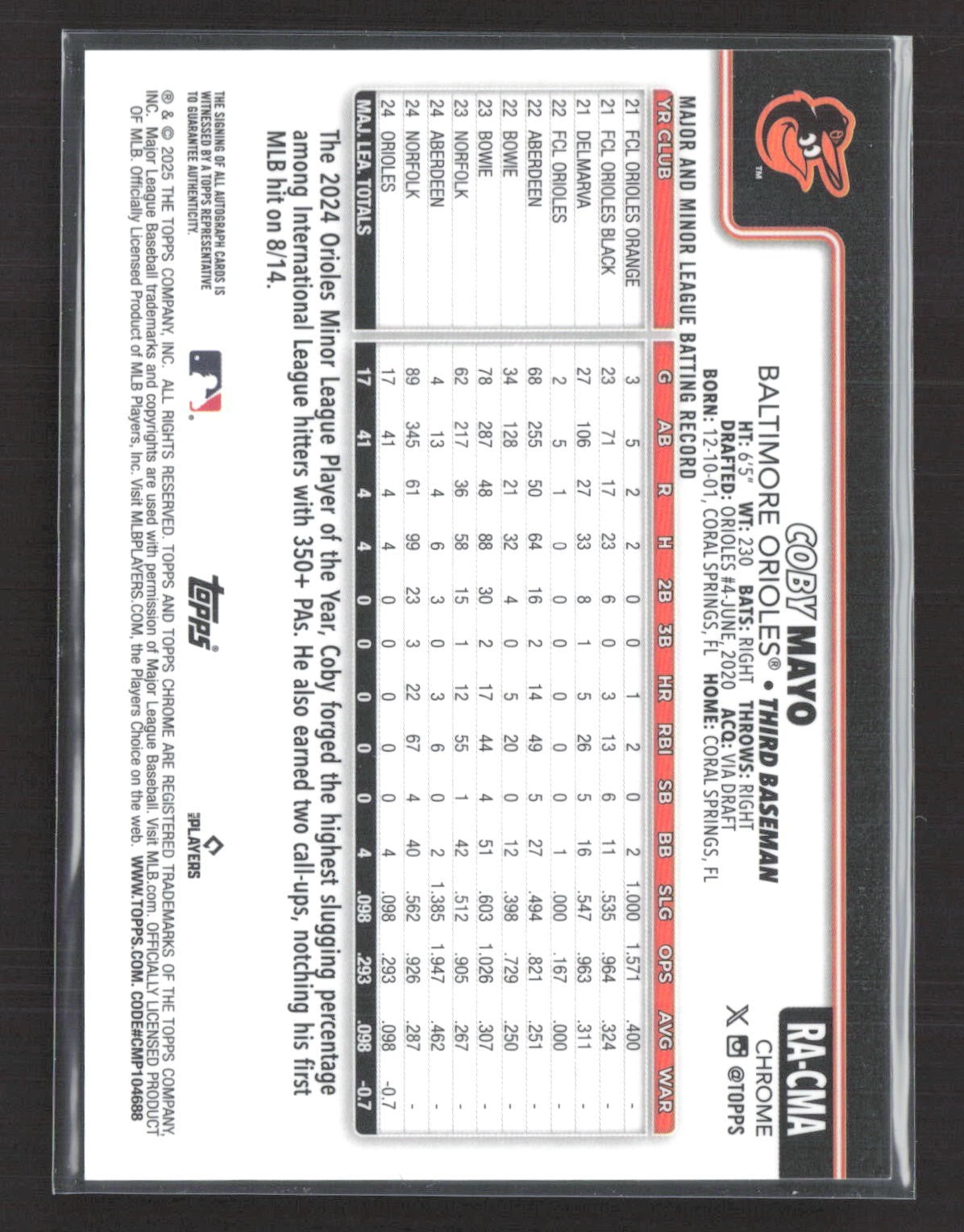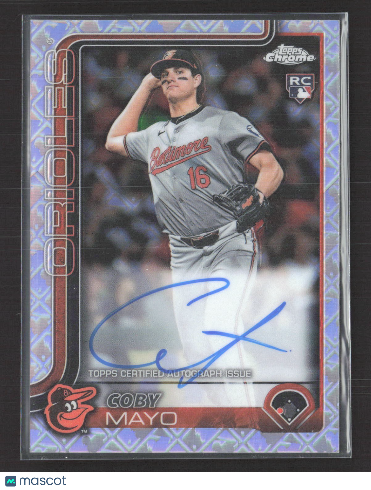 2025 Topps Chrome - Rookie Autographs Coby Mayo #RA-CMA (AU, RC) Listed With Mascot. Read more