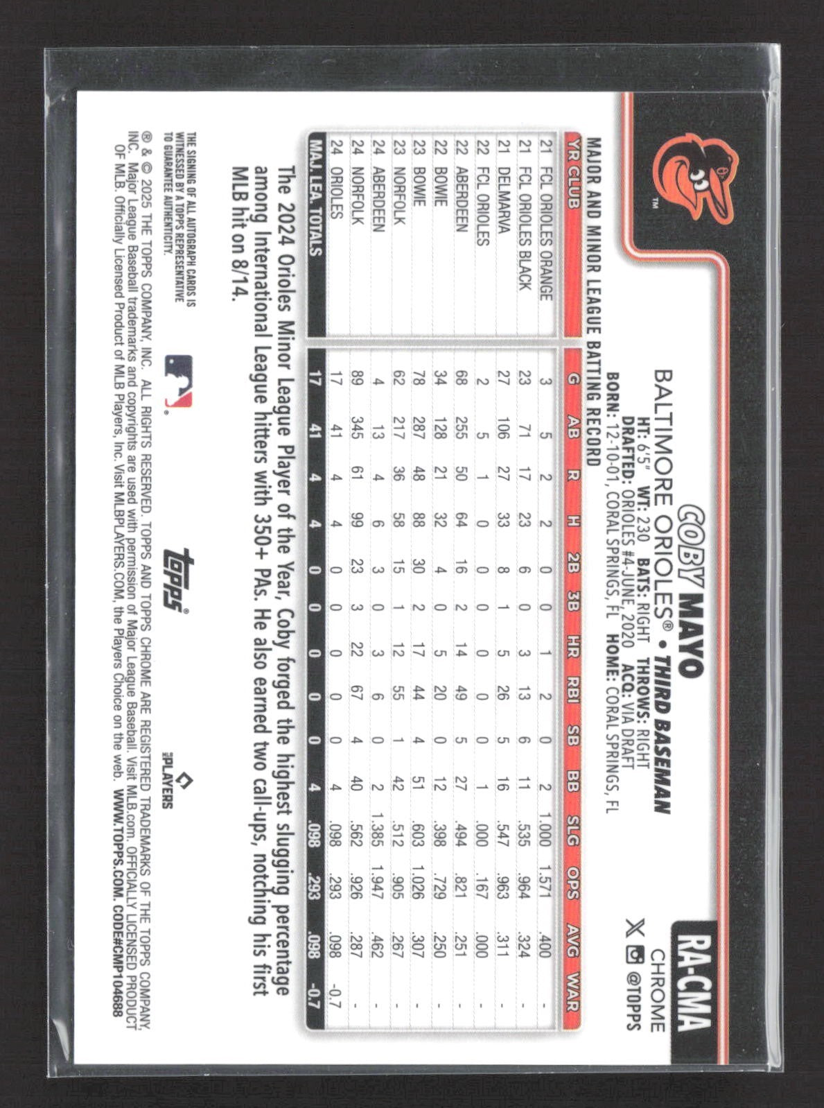 2025 Topps Chrome Rookie Auto Coby Mayo #RA-CMA Blue Logofractor /150